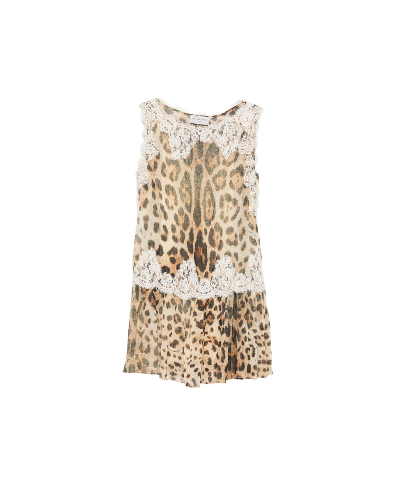 beige leopard print lace trim pleated skirt sleeveless round neck