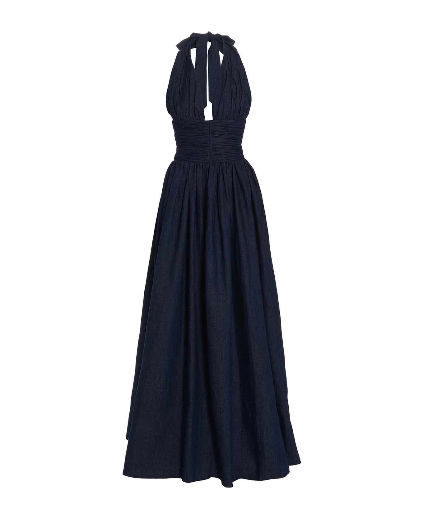Denim long maxi dress with V-neck, back fastening, pleats.