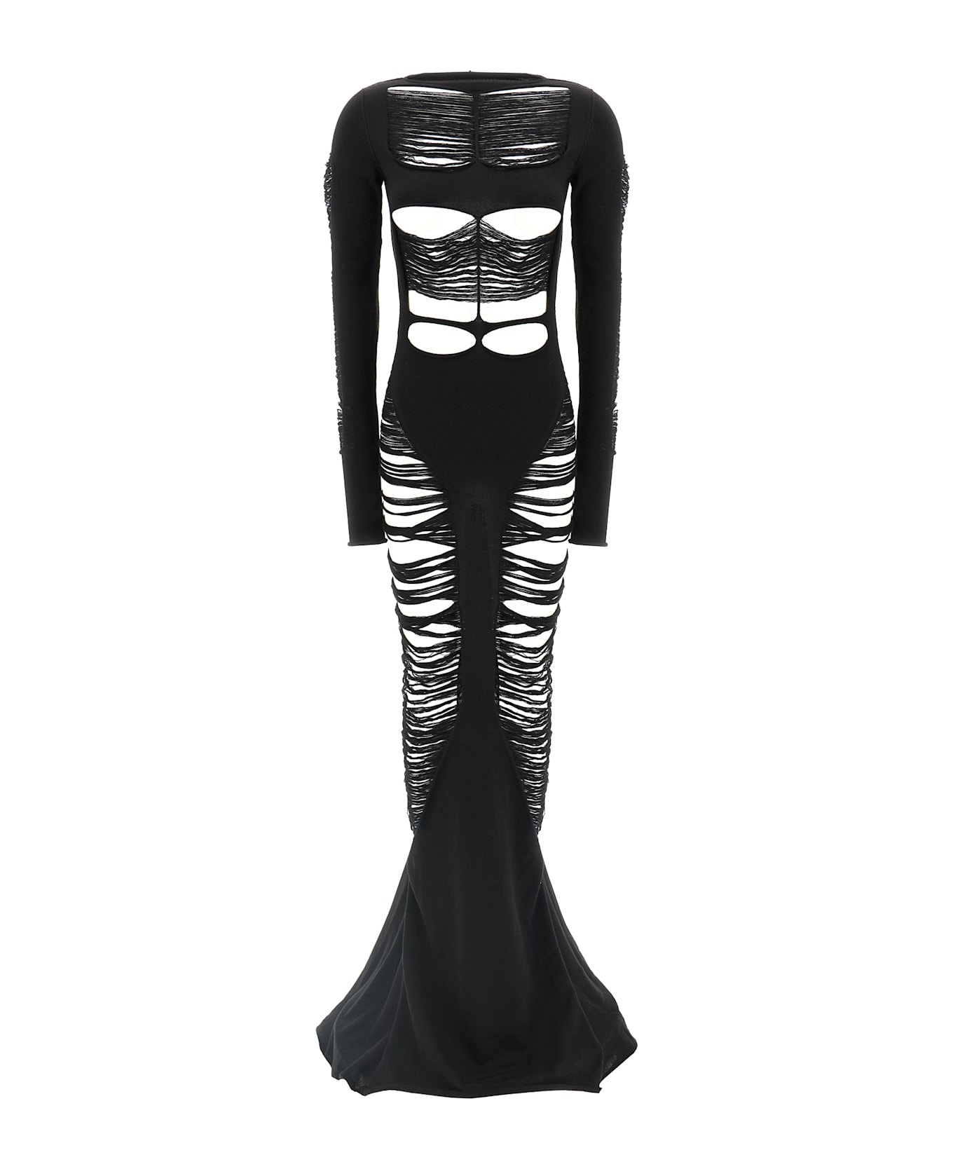 Long 'Luna' medium weight wool knit dress with cut-out and frayed details, boat neck, long sleeves, bare back, long train.