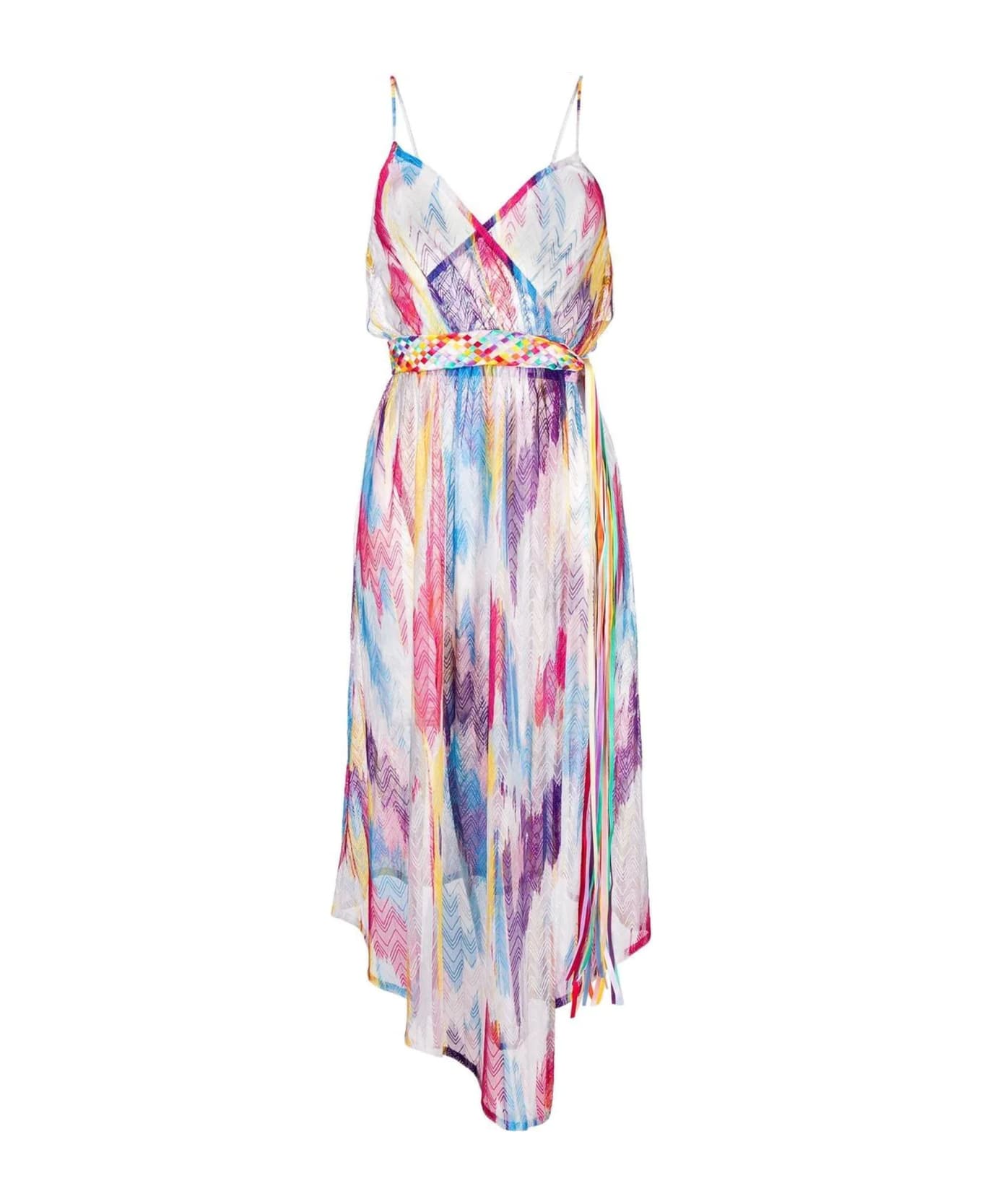 Multicolor asymmetrical midi dress, V-neckline, signature zigzag braiding design, spaghetti straps, sleeveless and asymmetrical hem. This is due to the artisanal nature with which all Missoni products are constructed.