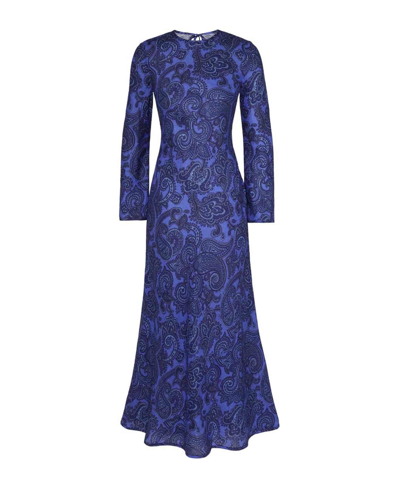 Ottie Bias Backless Dress in Blue Paisley, Linen long sleeve dress, Self tie at back neck, Invisible zip on skirt, High neck, Skirt cut on the bias Composition: 100% Linen