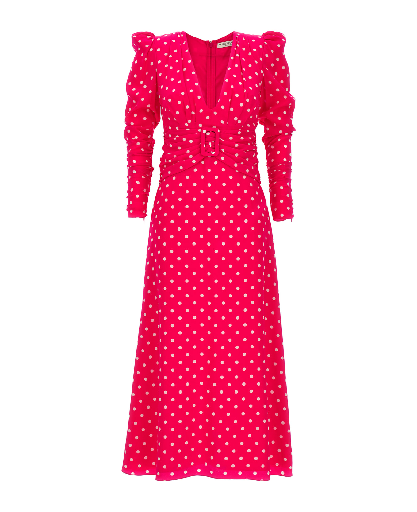 Silk dress with all-over polka dots, long sleeves, V-neck, draped detail with belt under the bust.