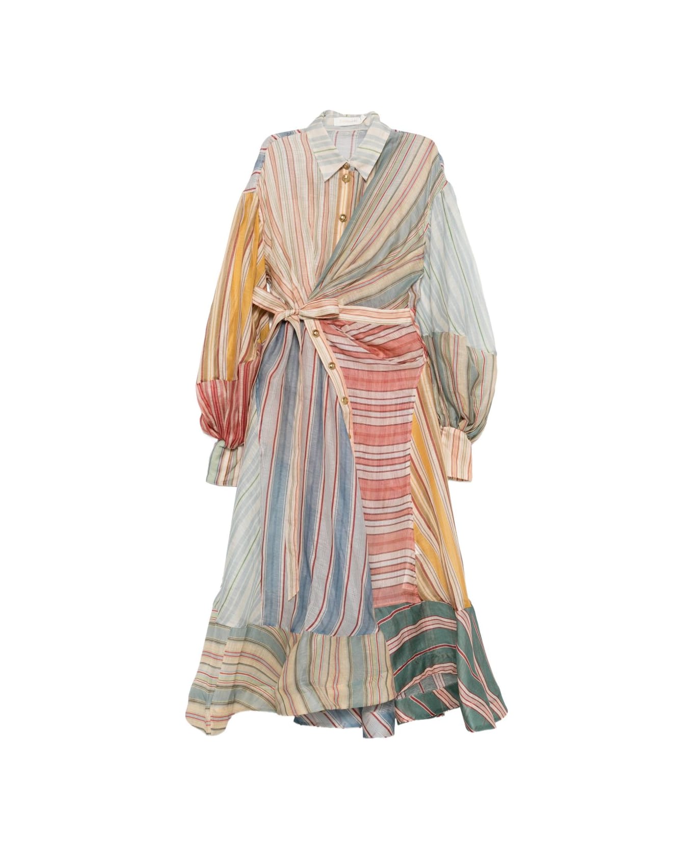 spliced stripes shirt collar button fastening belt long sleeves tiered hem