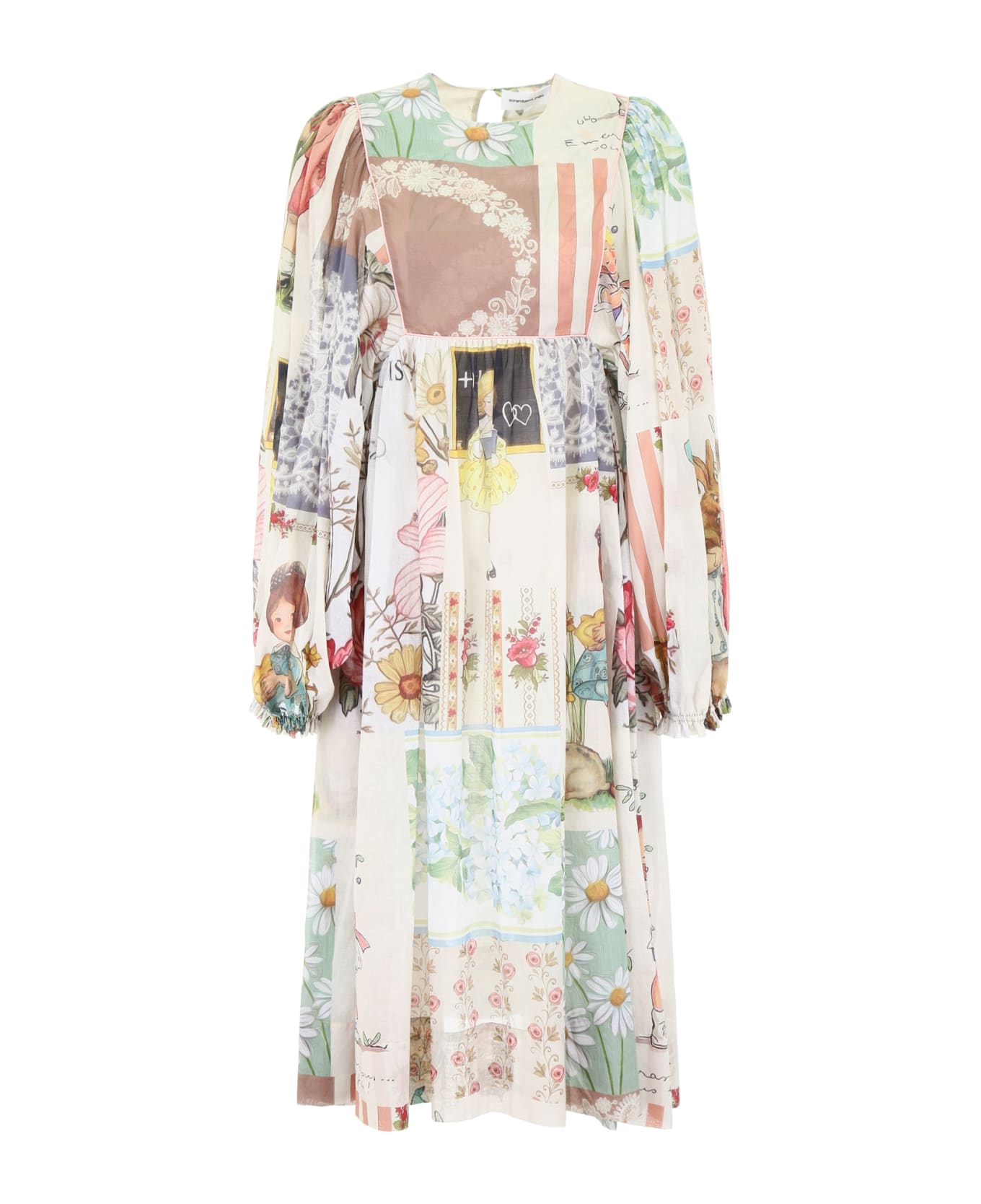 Scrambled Ego lightweight cotton dress with multicolor "patchwork" pattern. It features back keyhole with button closure, maxi puff sleeves and flared hem. Unlined. Model height is 177 cm. One size.