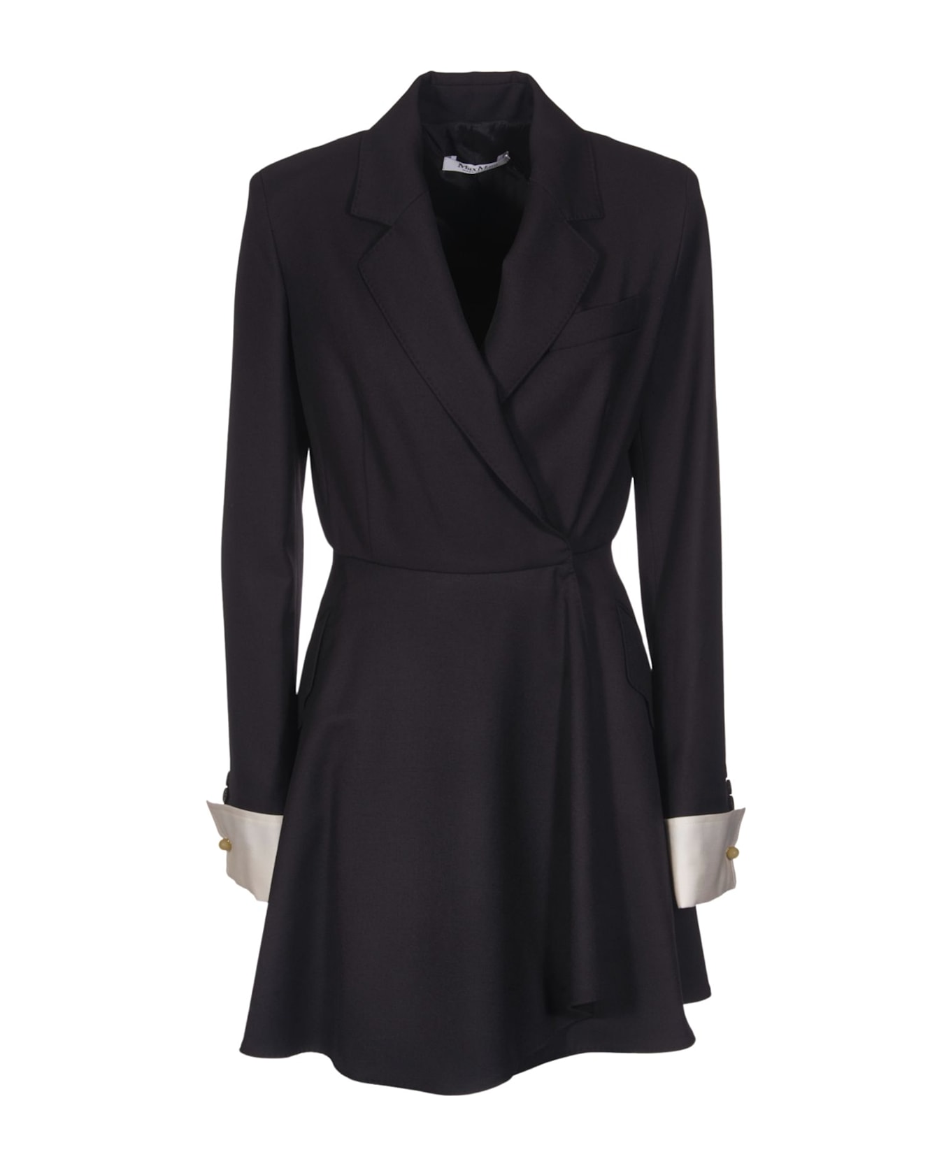Sella dress - Max Mara - black color - v-neck with classic lapels - flared wrap skirt - long sleeves - removable cotton satin cuffs - slanted top pocket - snap button closure