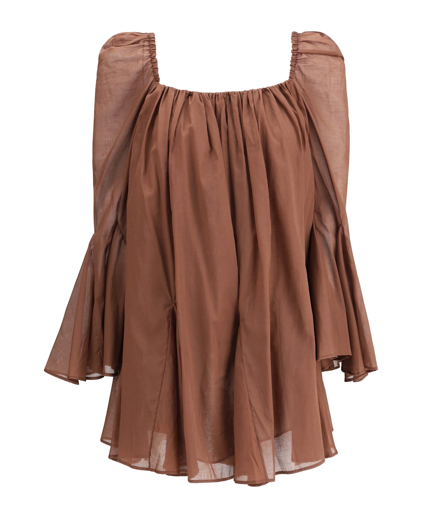 The whitney short dress by the andamane is a cool and sophisticated piece, perfect for an elegant summer look. the flared design, with a deep round neckline and stretch, delicately enhances the silhouette. flared sleeves add movement and lightness, while the included ribbon to tie at the waist allows you to customize the fit, creating a feminine and modern effect.