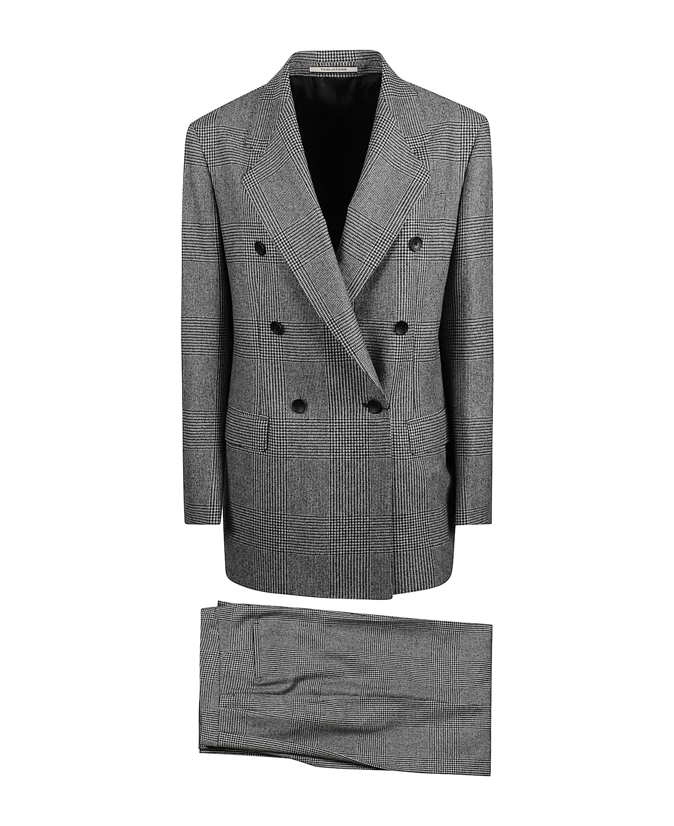 Gray TAGLIATORE suit featuring a checked pattern, a double-breasted jacket, and classic trousers.