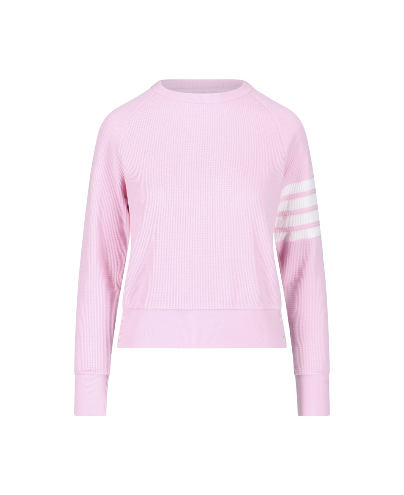 Thom Browne "waffle 4-bar" pink cotton crewneck sweatshirt with iconic white striped sleeves, side buttons on the hem, tricolor grosgrain tongue on the back, ribbed trim, straight hem.