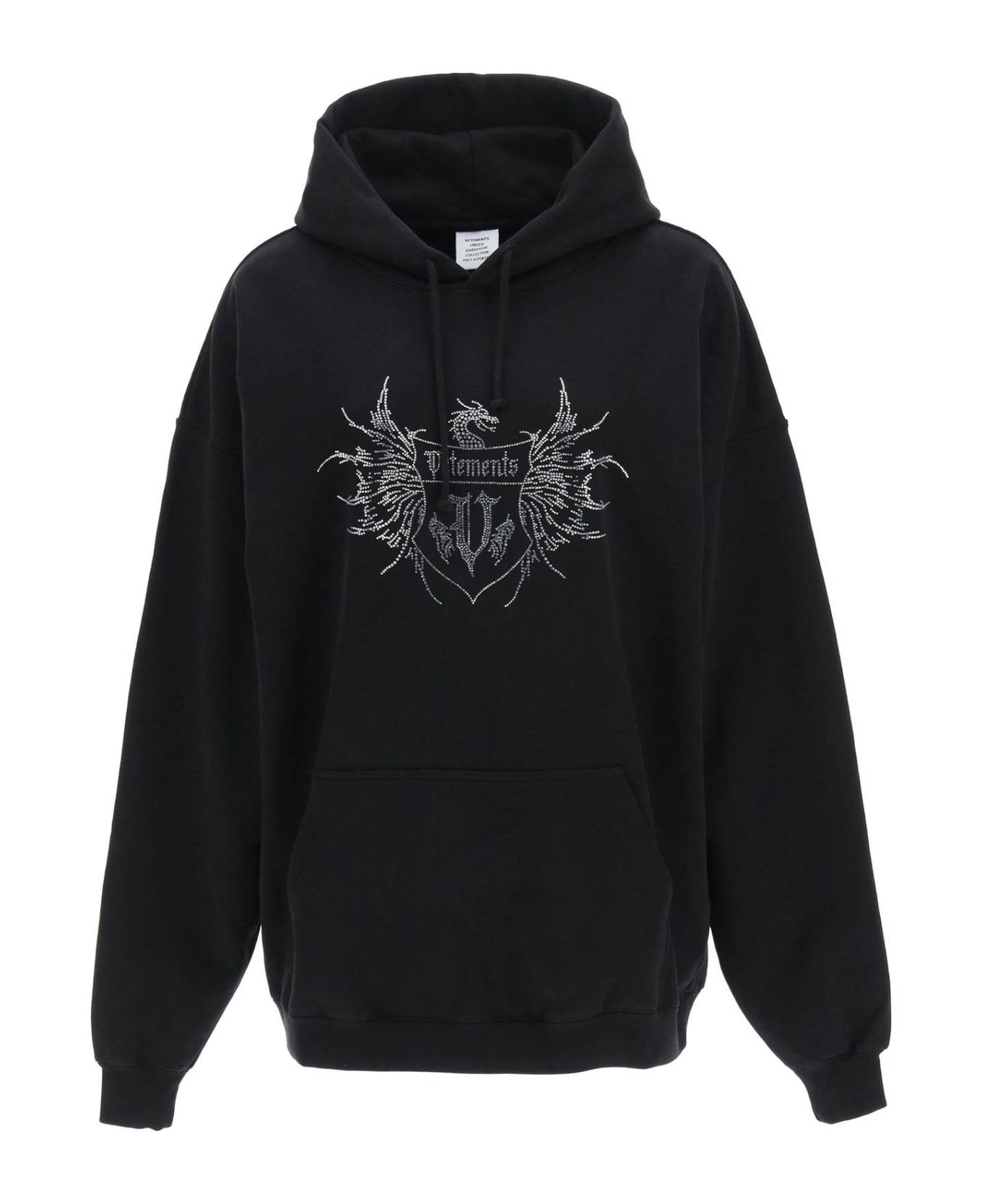 Vetements oversized unisex sweatshirt in heavy cotton blend French terry with logo crest graphics made of crystals. Drawstring hood, kangaroo pocket, rib-knit cuffs and hem. Boxy fit. Logo lettering detail embroidered on the edge of the hood. The model is 177 cm tall and wears a size XS.