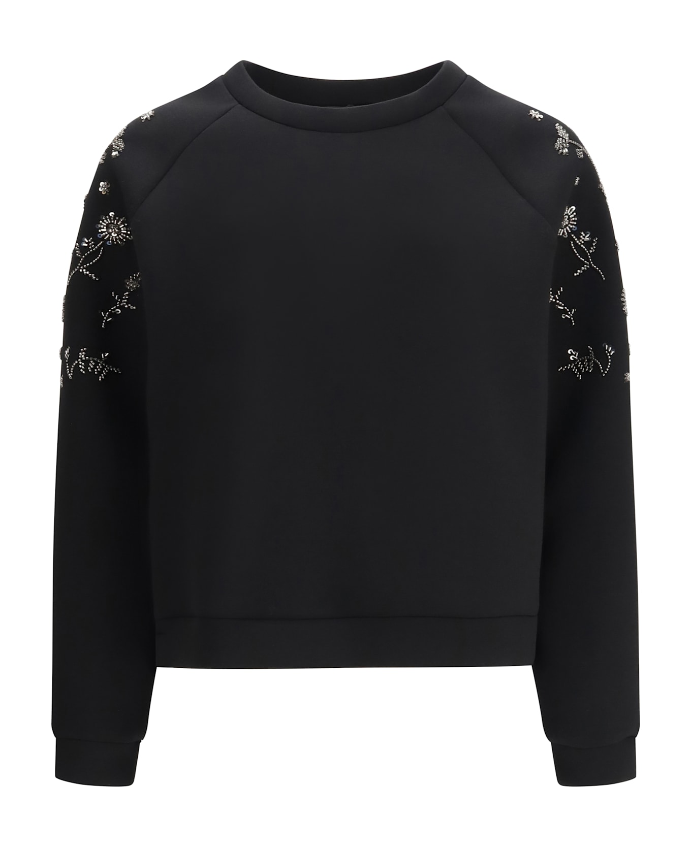 The tema sweatshirt by weekend max mara is crafted from knit fabric and enhanced with decorative appliqués that highlight its distinctive character. the relaxed cut allows full freedom of movement and everyday comfort. it features a classic crew neckline and long sleeves, while the beaded embellishment adds a luminous and feminine touch.