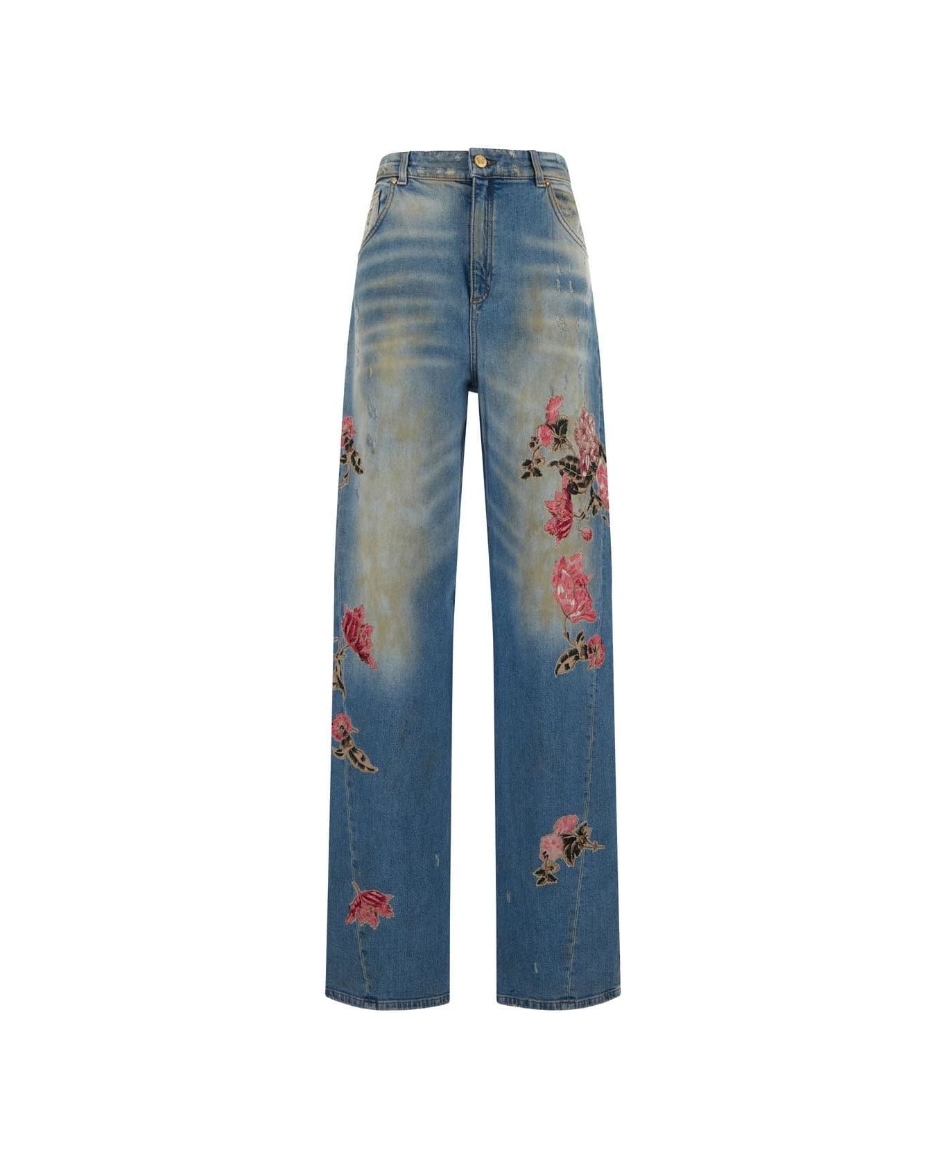 Blumarine jeans in blue denim with embroidered flowers. The item is featured by distressed look, five pockets and zip fly.