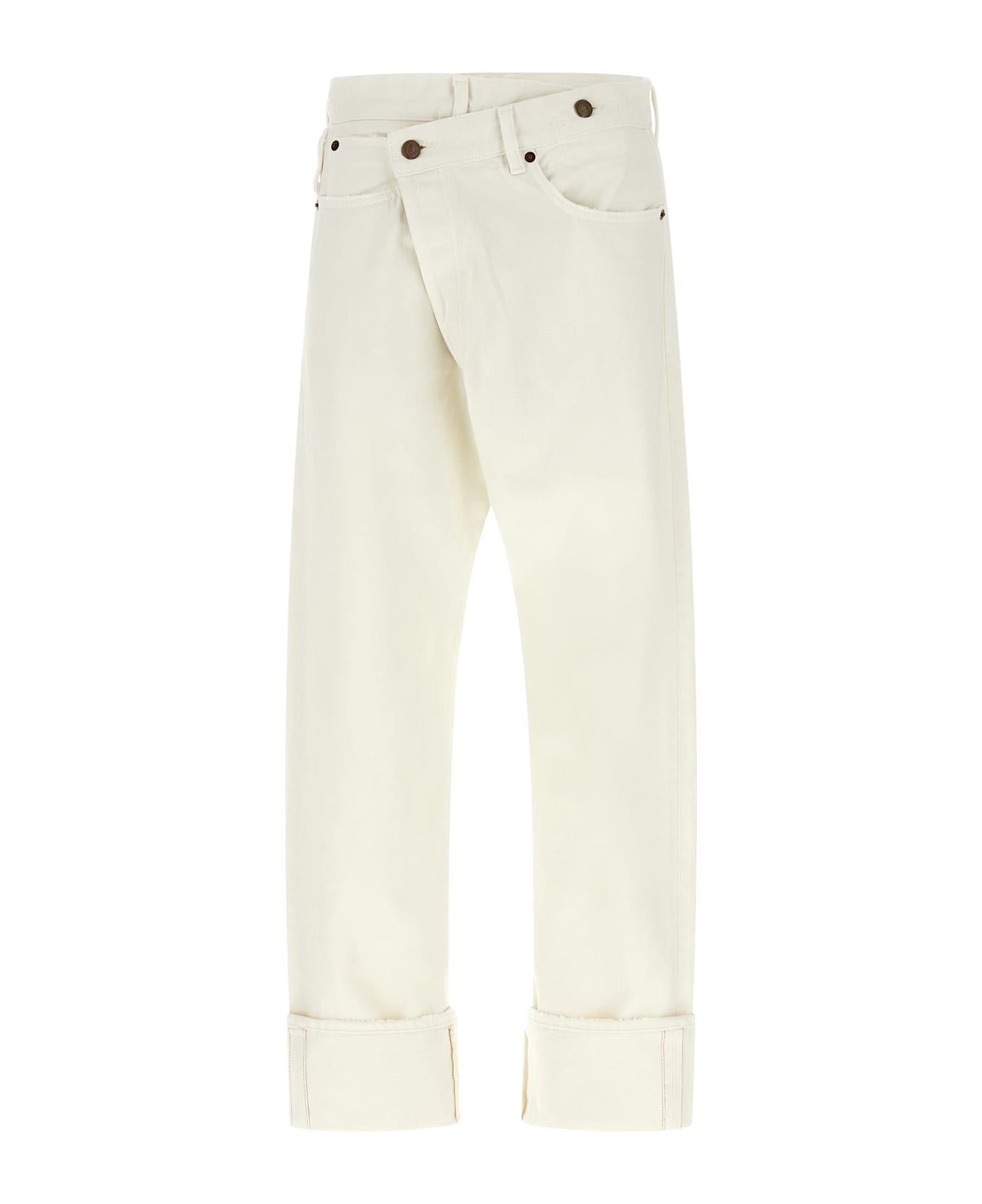 'Cuffed Crossover' cotton denim jeans with asymmetric button closure, five pockets, leather logo label at the back, maxi turn-up on the leg bottom. Composition: 100% cotton