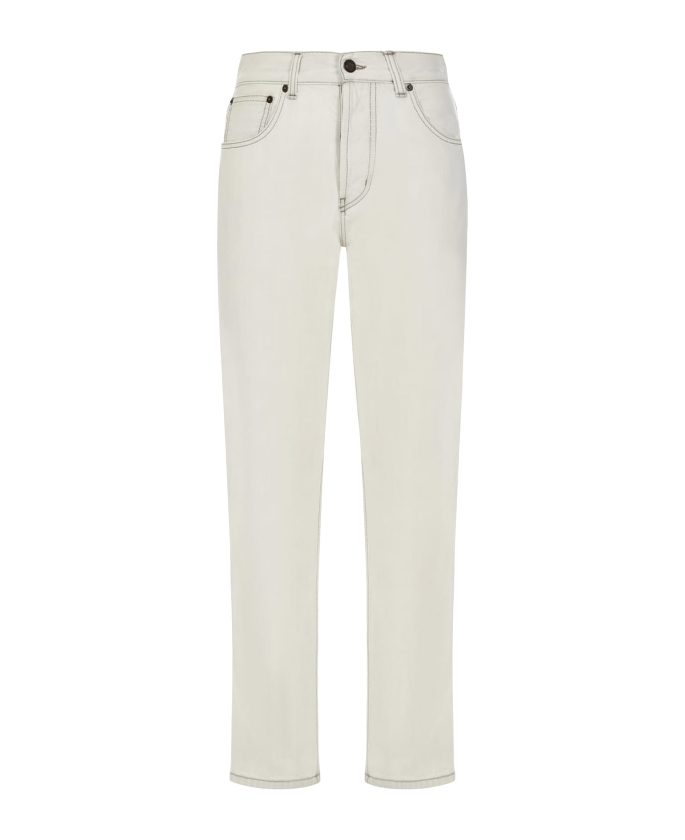 Fabrics in off-white gray cotton denim, the jeans by Saint Laurent are characterized by a straight leg cut with a classic five-pocket design and a waist with belt loops. The slightly worn effect treatment and the black leather label on the back pocket complete the high-waisted model ideal for enhancing your silhouette.