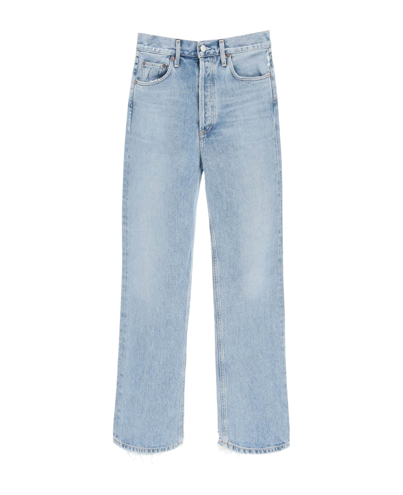 Agolde five-pocket jeans in washed organic cotton denim, with small distressed detailing on the front pockets and ripped cuffs. Button fly. Loose fit featuring high-rise waist and straight cut. The model is 177 cm tall and wears a size 26.