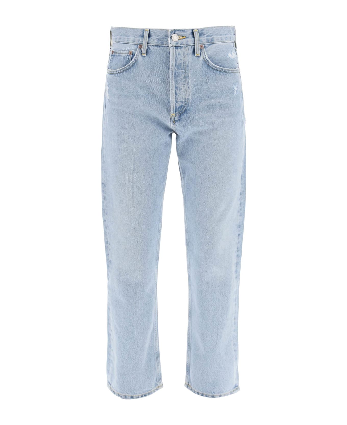 Agolde five-pocket model jeans crafted in non-stretch cotton denim with light wash. They feature button fly and distressed detailing. Regular fit with tapered leg. The model is 177 cm tall and wears size 26.