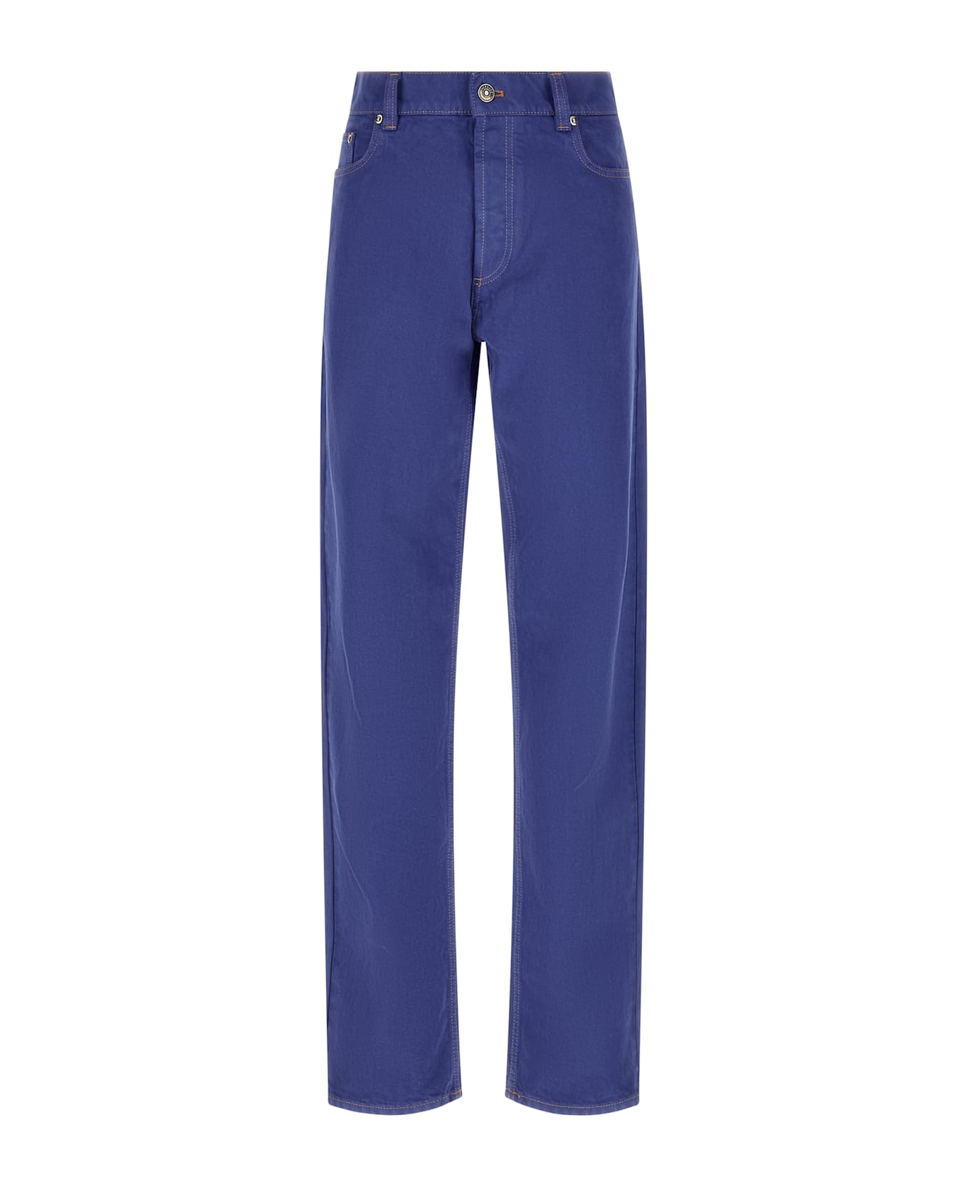 Garment-dyed cotton denim jeans with contrast stitching, wide and straight leg, high waist, front zip and button closure, five pockets, adjustable leg bottom with button, leather logo tag with embossed Versace Logo and a three-dimensional metal 'Medusa'.