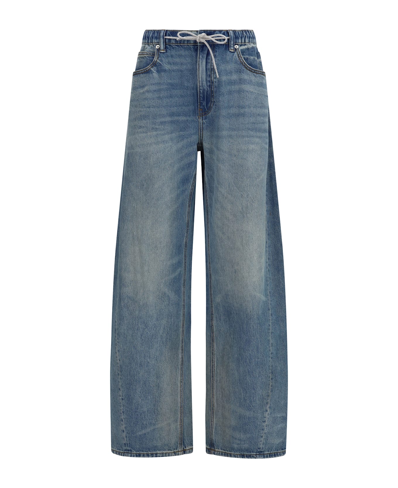 The wide-leg denim jeans by alexander wang stand out for a contemporary silhouette that interprets denim with a relaxed and modern aesthetic. the jeans model by alexander wang features an elasticated waistband with a jewel drawstring that adds a distinctive detail. the concealed zip fastening with a visible button defines the structure of the garment, while the classic five-pocket design recalls traditional denim styles. the washed pure cotton denim and the logo label on the back complete the alexander wang jeans with an urban and sophisticated style.