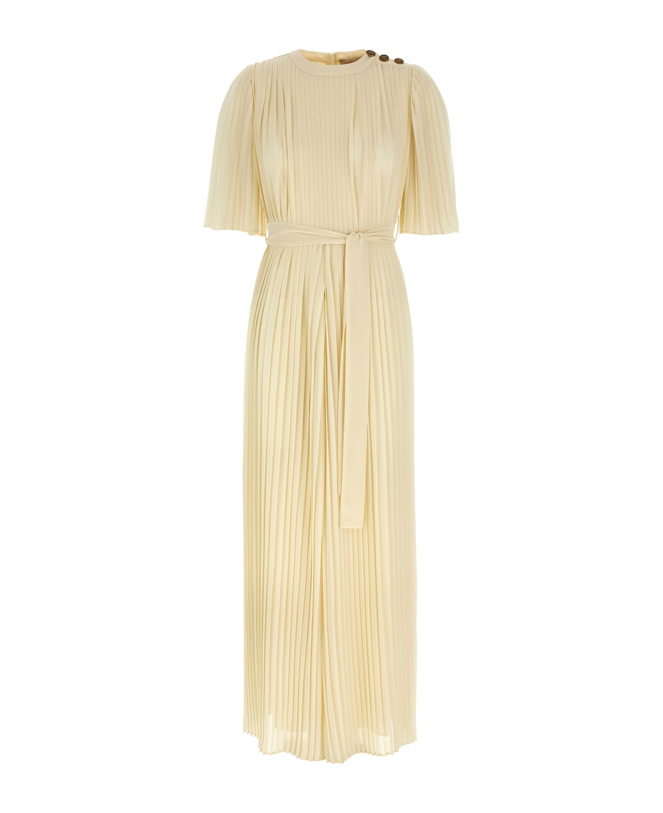 Long jumpsuit in pleated fabric, very wide trousers, short sleeves, crew neck. Equipped with removable fabric belt. Invisible zip on the back.