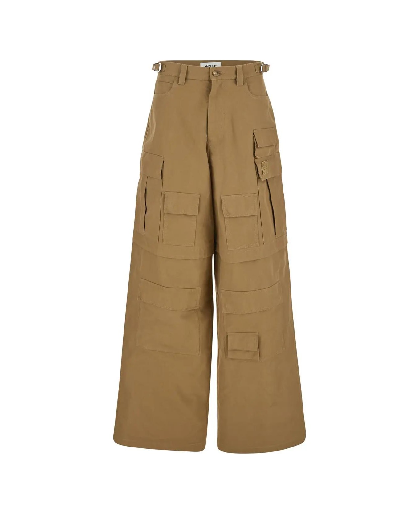 Ambush trousers in beige cotton with belt loops. The item is featured by zip and button closure, side pockets and wide leg.