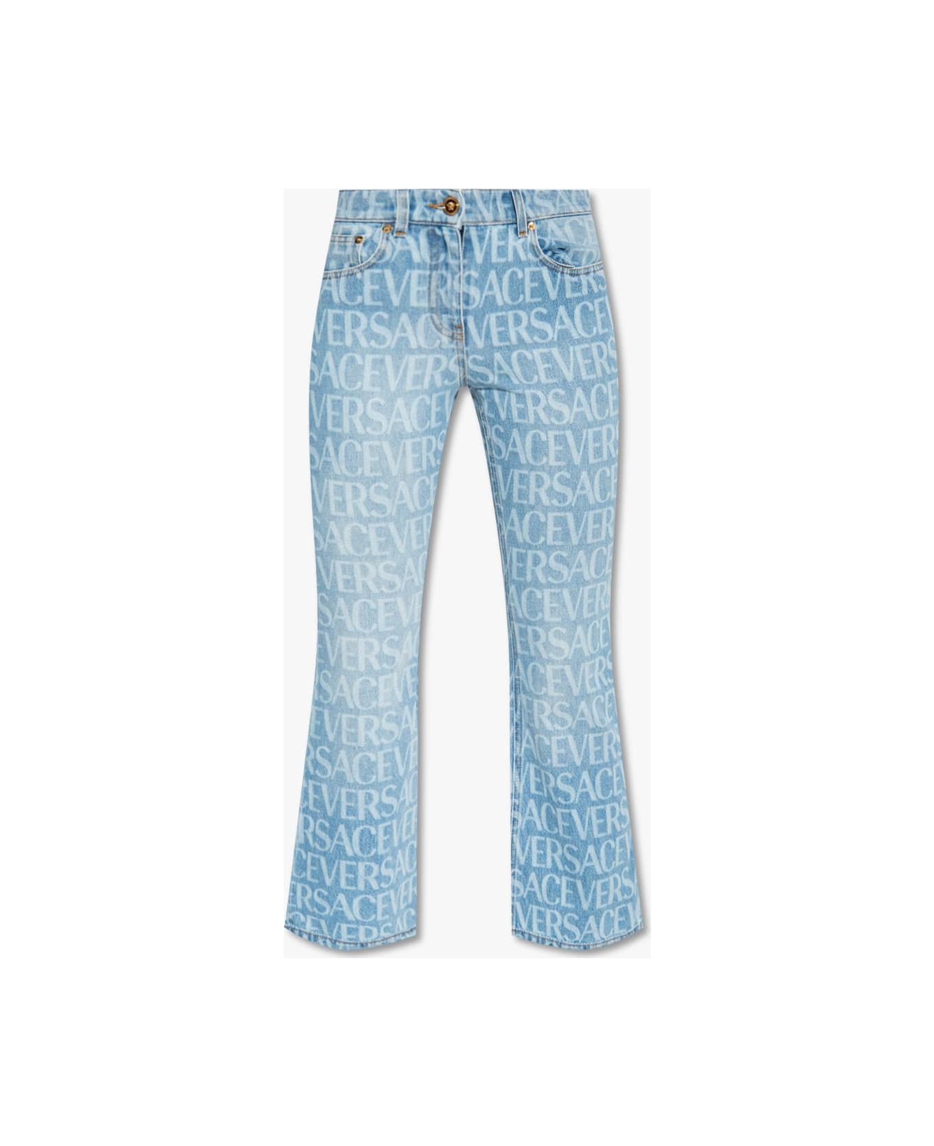 Blue jeans from Versace. Embellished with a monogram motif, this pair falls with flared legs and features a zip fly with a gold-tone Medusa button and classic five pockets.