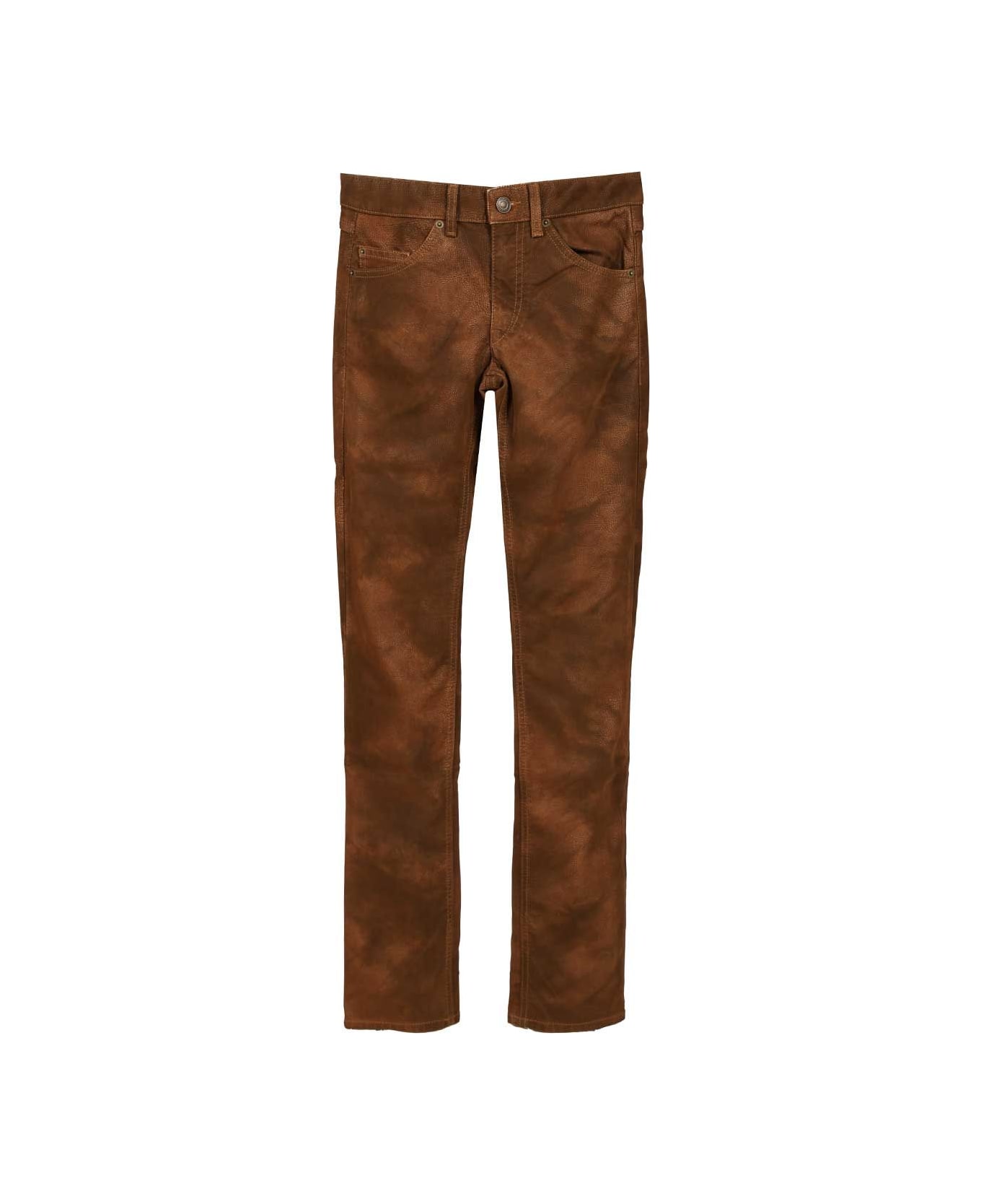 leather effect design with five pockets, tone-on-tone stitching, button fly