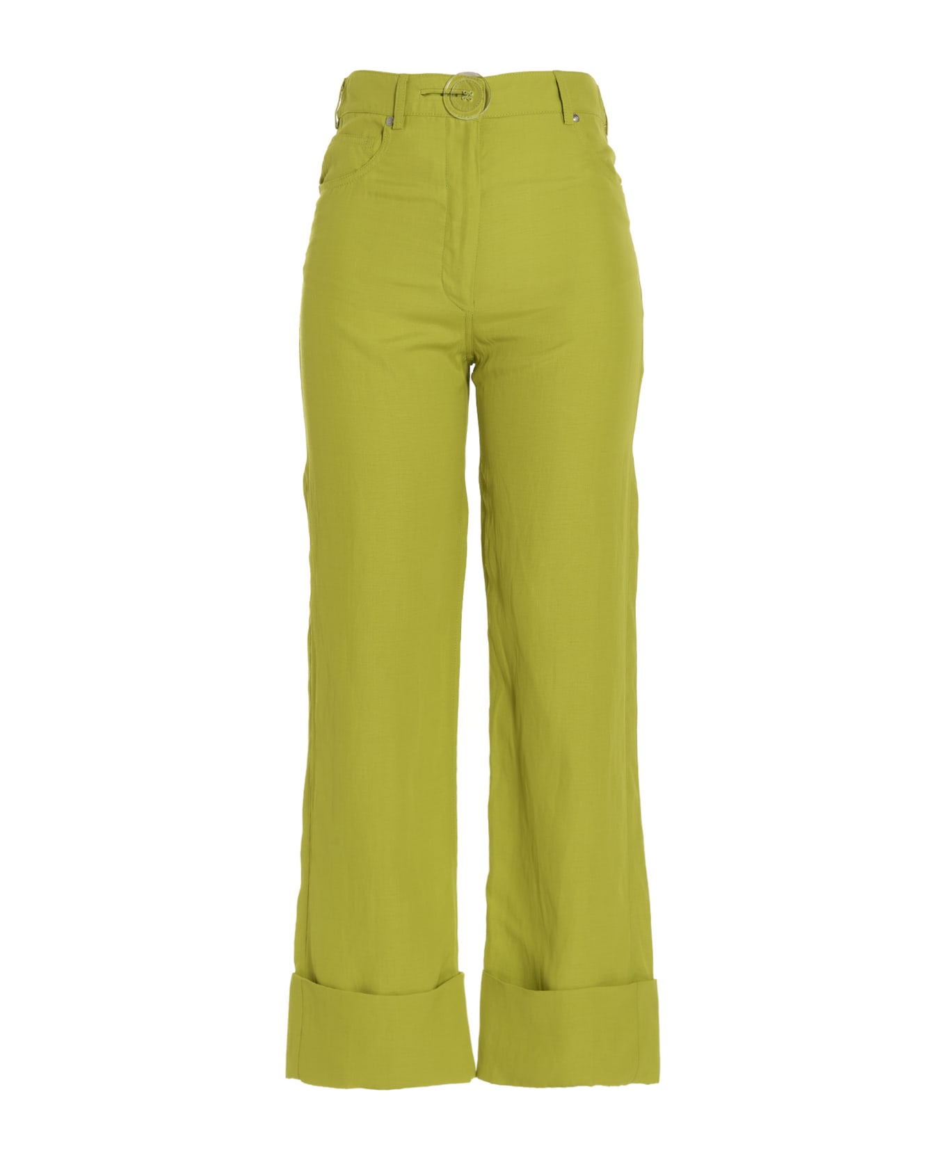 Viscose and linen pants with zip and maxi button closure, five pockets, leather logo tag and turn-up hem. Composition: 72% viscose 28% linen