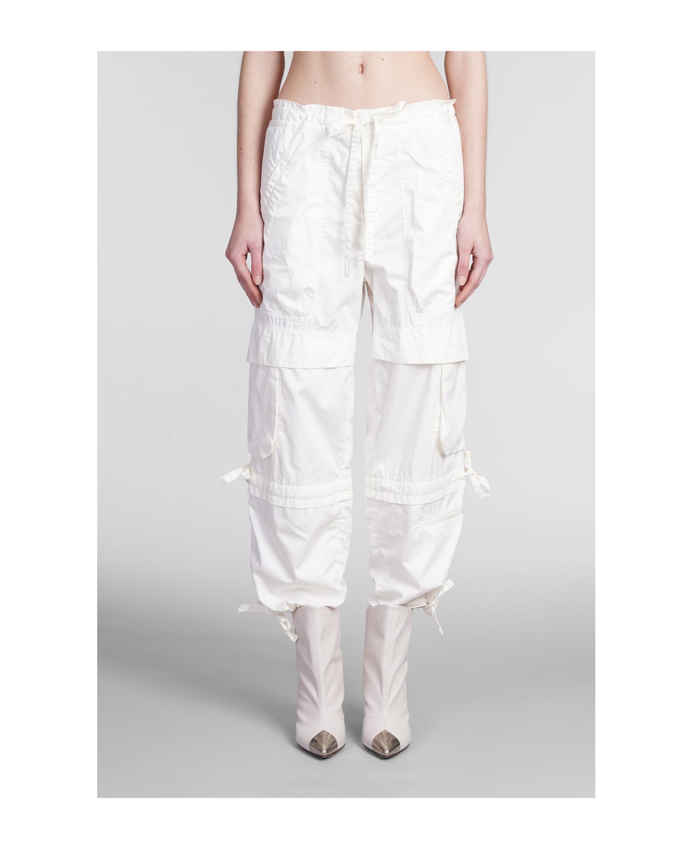 Nazemi Pants in white cotton, elastic waistband, laces detail, cargo pockets, zip clousure, 60% viscose, 21% cotton, 14% silk, 5% Elastan, Model is 180 cm and wears 36