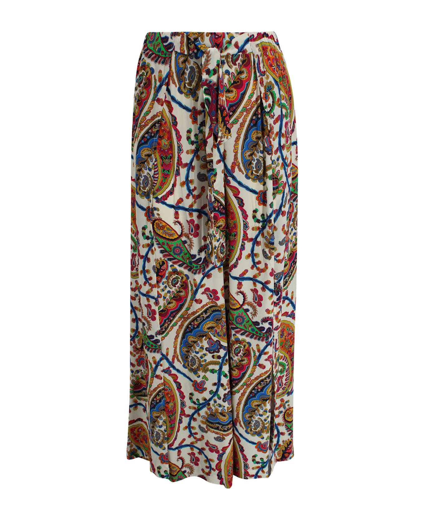 Palazzo trousers crafted from crêpe de Chine, featuring an all-over floral paisley motif. Designed with a partially elasticated high waist at the back and a matching tie belt at the waist.