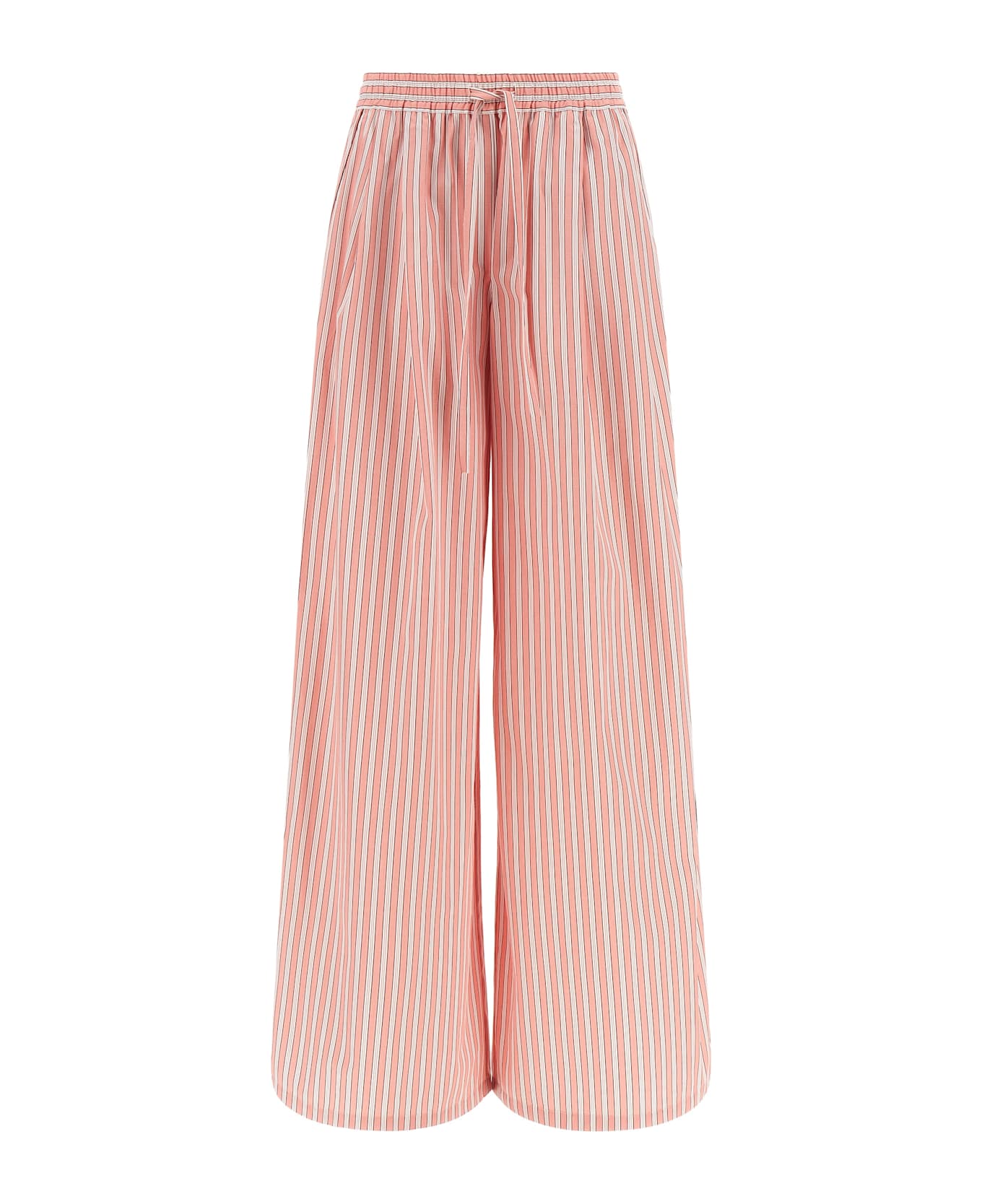Striped cotton and silk blend poplin pants, contrast solid color piping, pajama style, low waist, wide and straight leg, drawstring elastic waistband, trompe l'oeil flap, front French pockets, back welt pockets. Composition: 95% cotton 5% silk