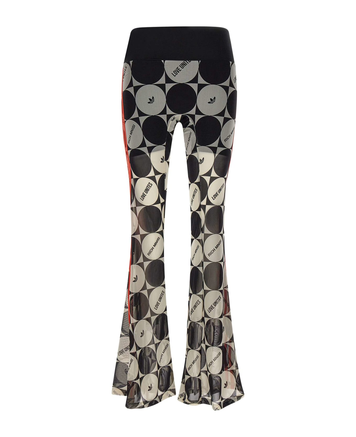 Adidas by Rich Mnisi "Pride Rm" women's leggings, multicolor optical pattern, black and white tones and fluo orange profiles, made of at least 70% recycled materials, black colorbloc elasticated waist with contrasting logo lettering, iconic side bands, wide on paw hem, slim fit. Adidas' commitment to honor LGBTQIA+ community.