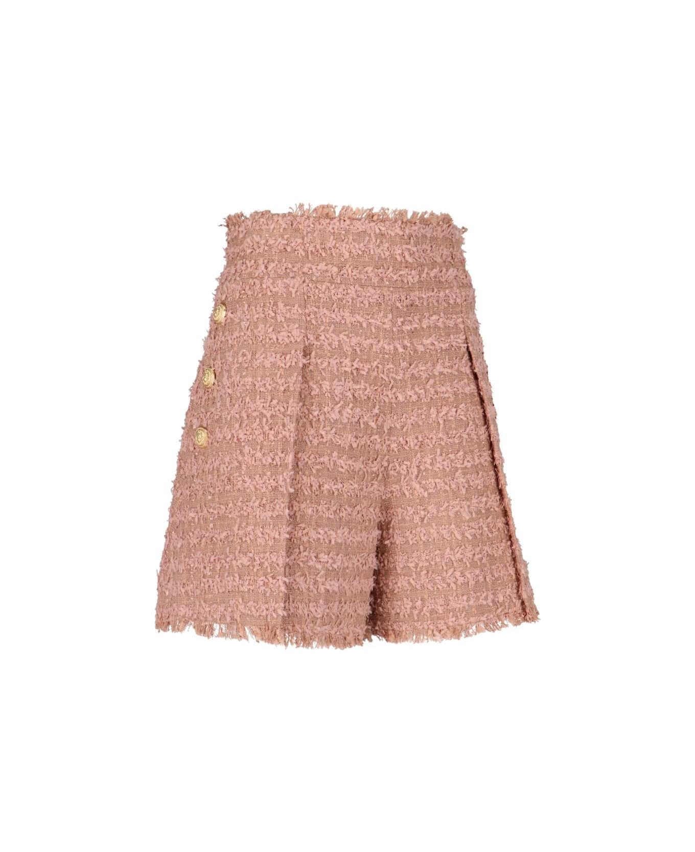 Flared balmain tweed pants, with pink, powder tone, high waist, a back zip closure, two front pinces, two side welt pockets, gold metal button detail, and frayed hem.