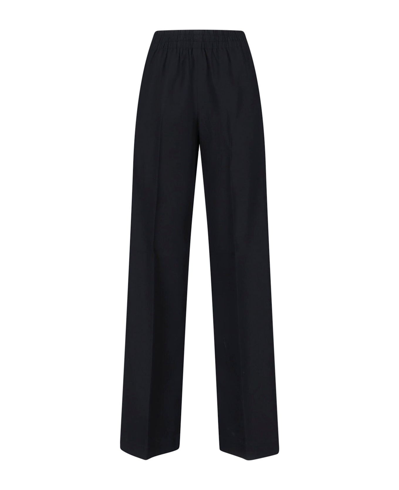 Golden Goose black virgin wool pants with high elastic waistband, two side welt pockets, gold metal "Star" logo detail on the back, straight leg.