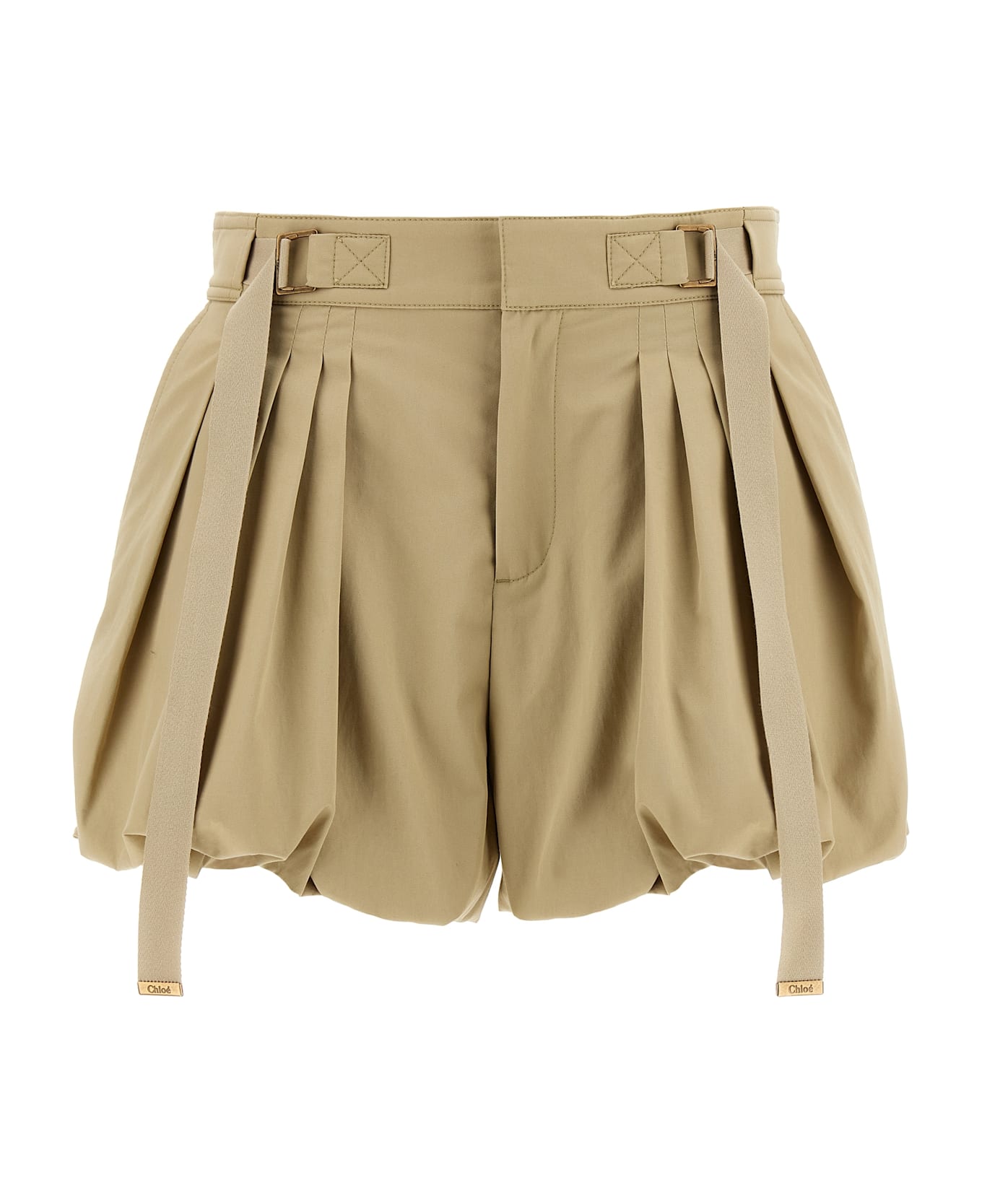 Short in light cotton gabardine, balloon style with pleats and ruffles, tone-on-tone embroidered logo on the back, adjustable belt, pockets, zip hook and front button closure. Composition: 100% cotton