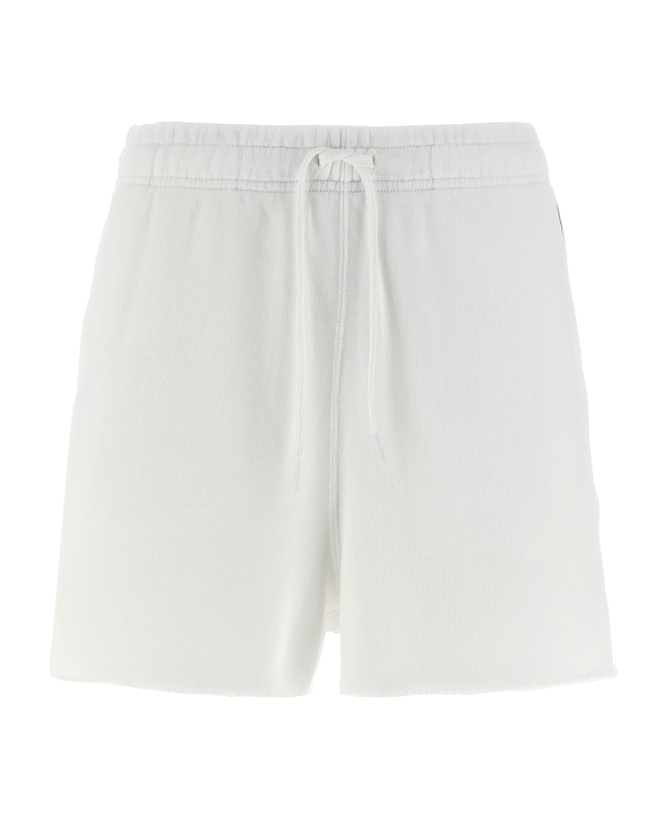 Brushed cotton shorts, front logo embroidery, adjustable drawstring elastic at the waist, pockets, leg bottoms with raw cut hem.