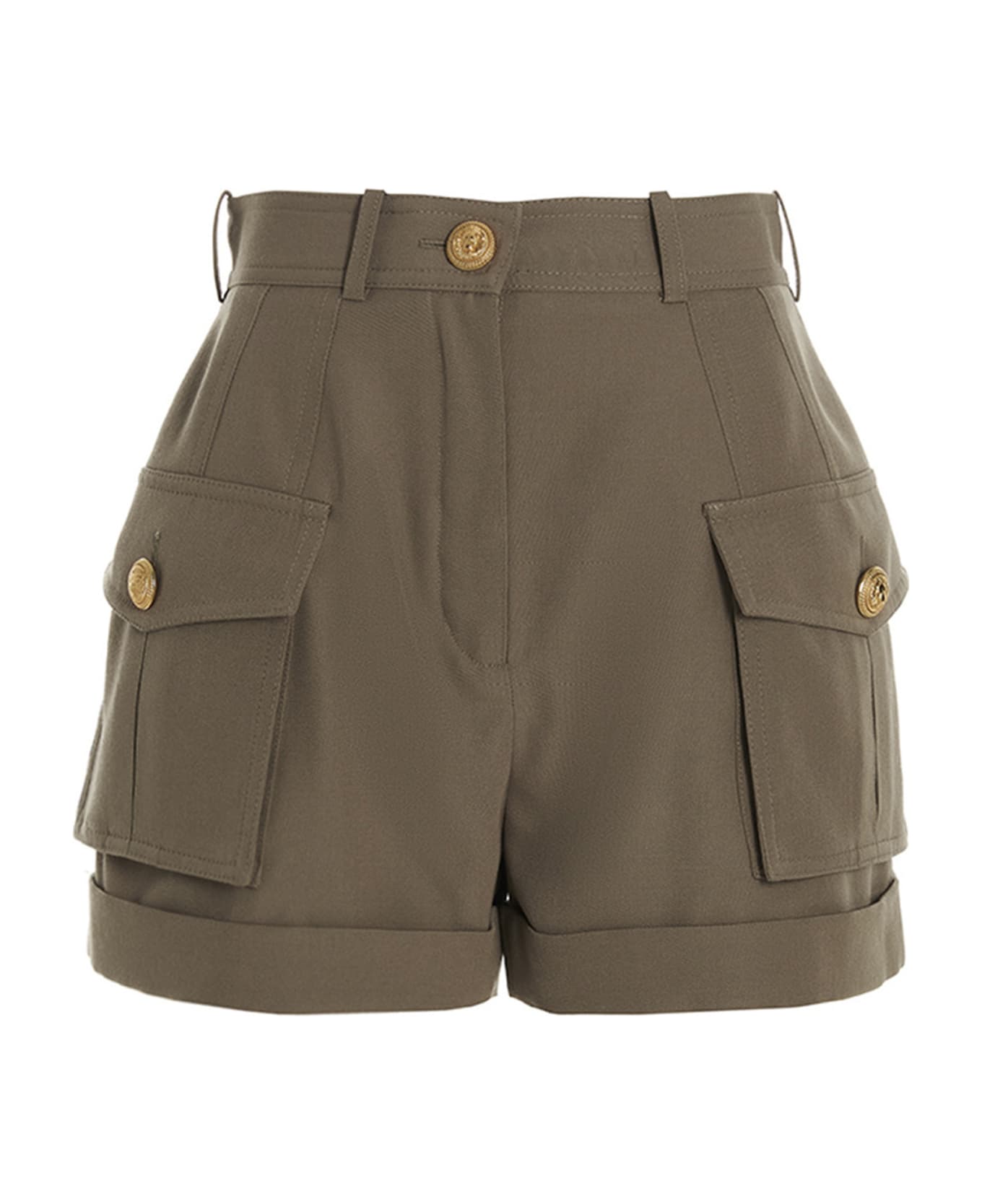 Grain de poudre wool cargo shorts with 3 gold color embossed buttons, side gusset pockets and a zip closure.