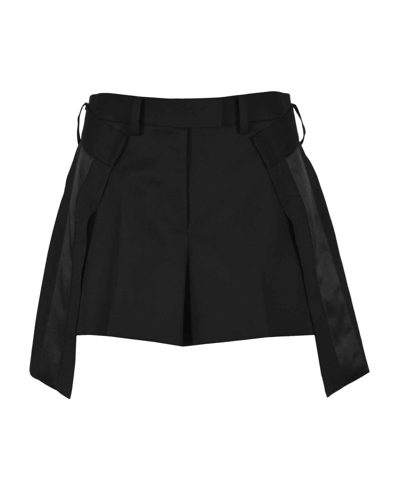 Black Wool Blend Asymmetric Shorts By Sacai. Featuring: - High Waist; - Concealed Front Fastening; - Belt Loops; - Rear Welt Buttoned Pockets; - Short Length; - Asymmetric Panels.