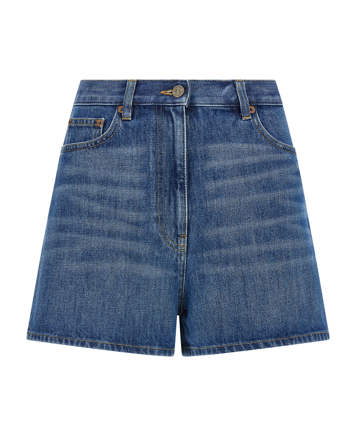 Solid denim shorts medium stone washed with contrast stitching, zip and front button closure, pockets, VGold metallic antiqued effect detail on back pockets. Composition: 100% cotton