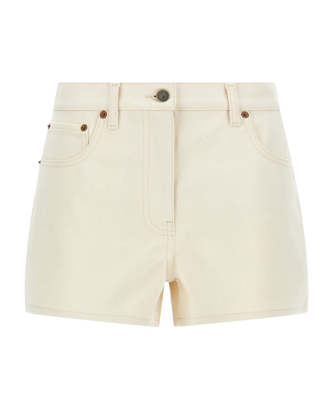 Garment-dyed Solid denim shorts, front zip and button closure, five pockets, antiqued metallic VGold detail on the pocket and leather logo patch at the back. Composition: 100% cotton