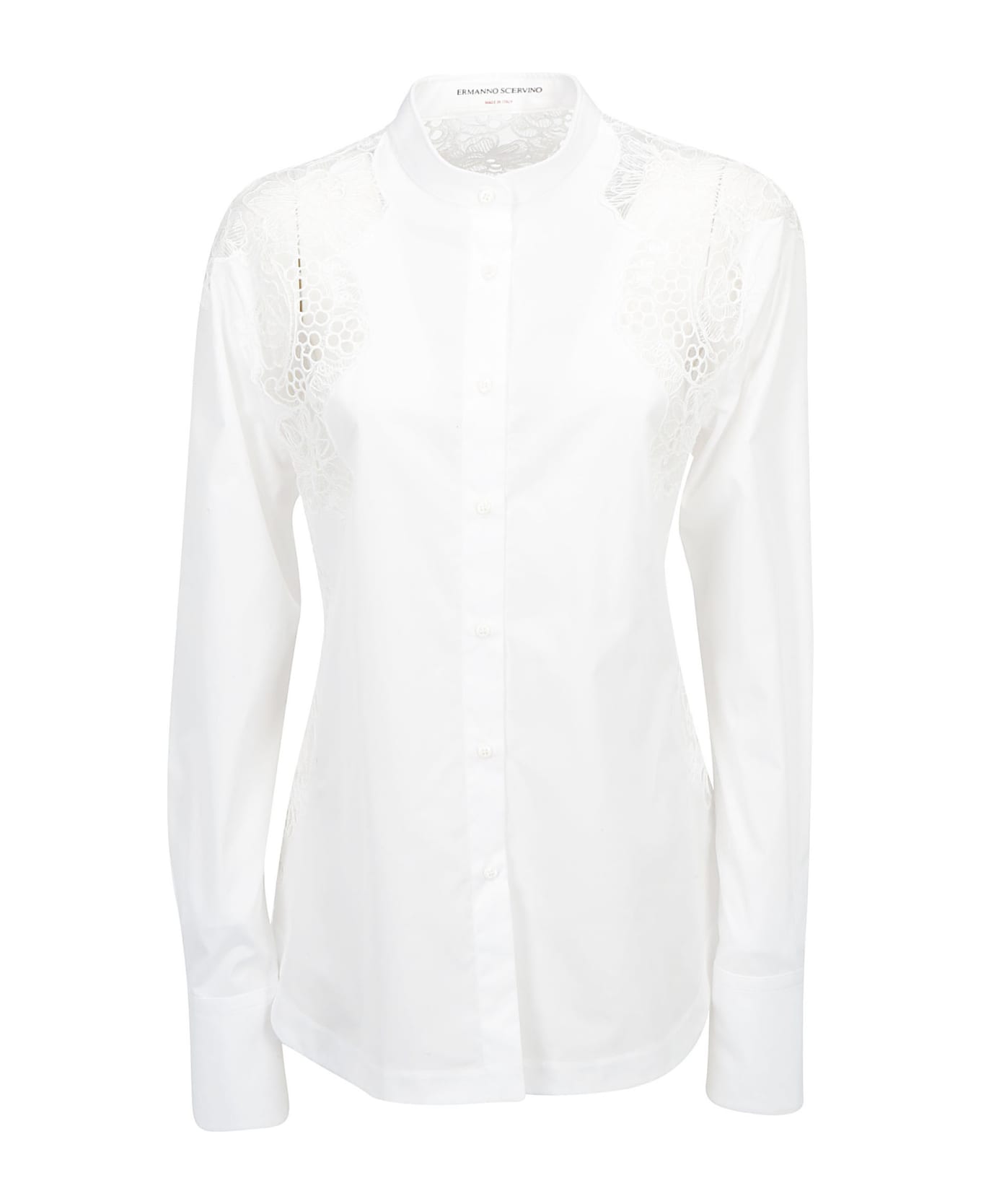 White Cotton Shirt by Ermanno Scervino, button down closure, lace details, classic collar, back panel longer than the front, back hole. Composition: 100% Cotton