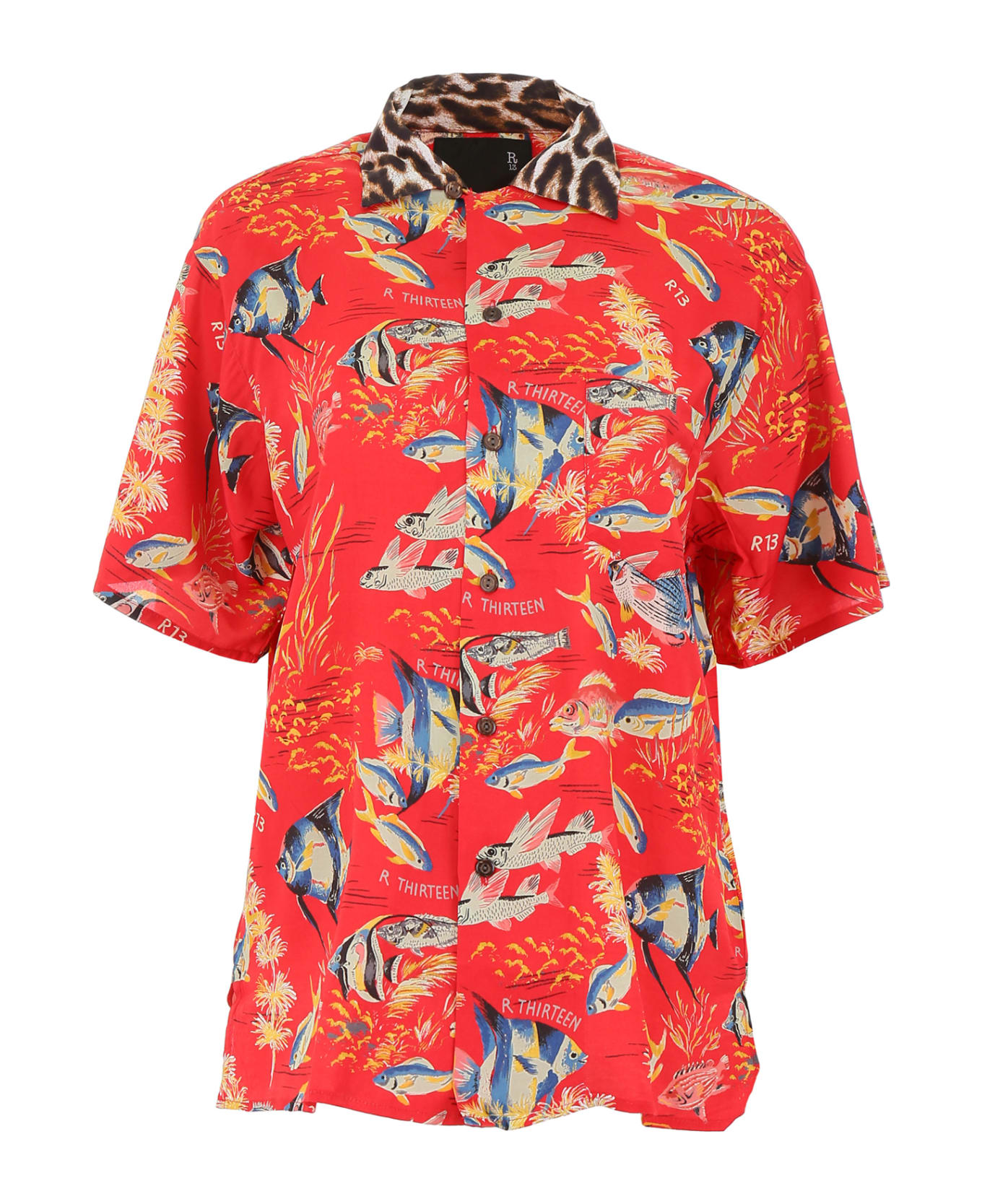 R13 boxy shirt with leopard-printed collar and all-over "fish" print. It features button closure and side vents. Model height is 177 cm and she is wearing a size S. Composition: 100% viscosa