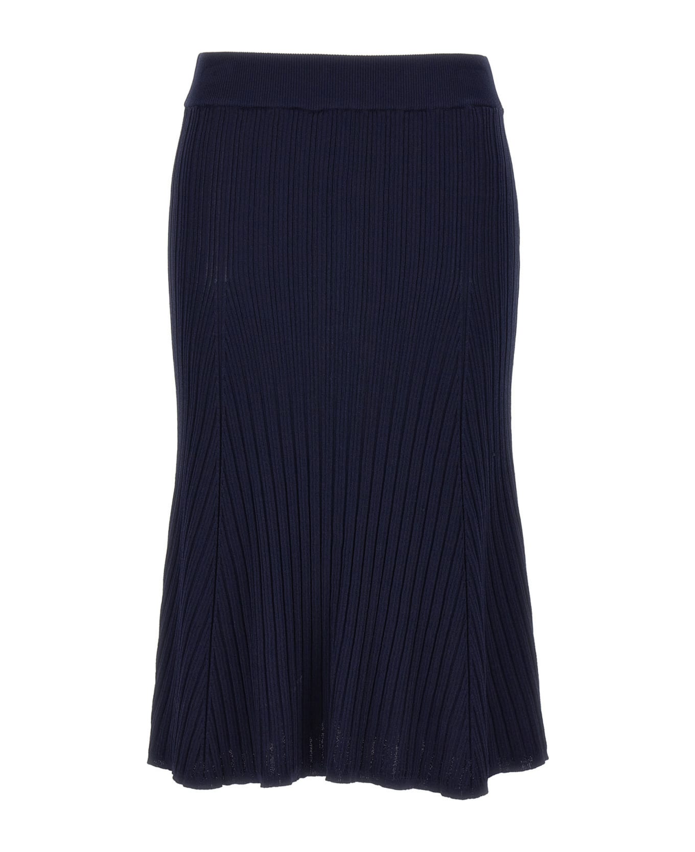 Flared viscose knit ribbed midi skirt with wide band at the waist.