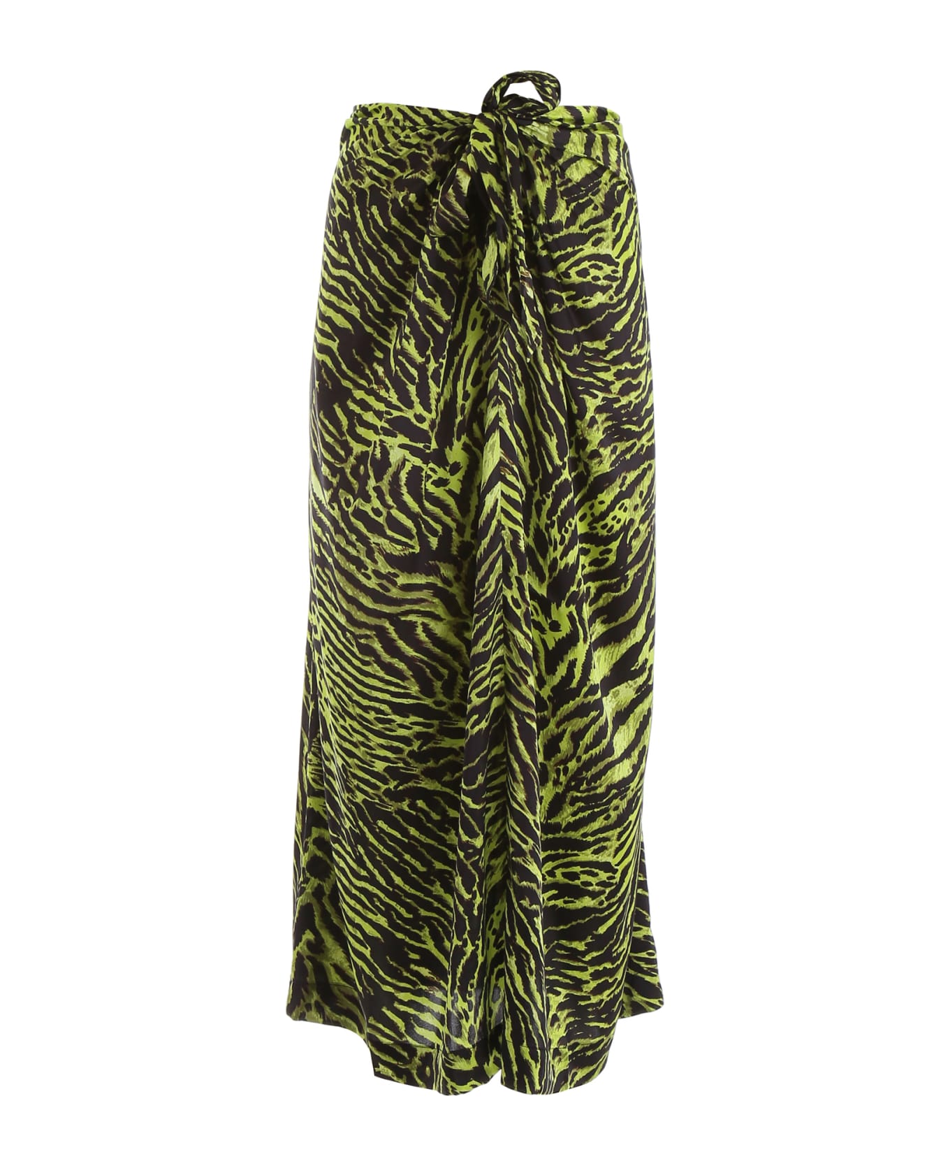 Ganni stretch silk satin midi skirt with zebra print. It features a draped front with decorative bow and elastic waistband on the back. Unlined. Model height is 177 cm and she is wearing a size FR 34. Composition: 92% seta, 08% elastan