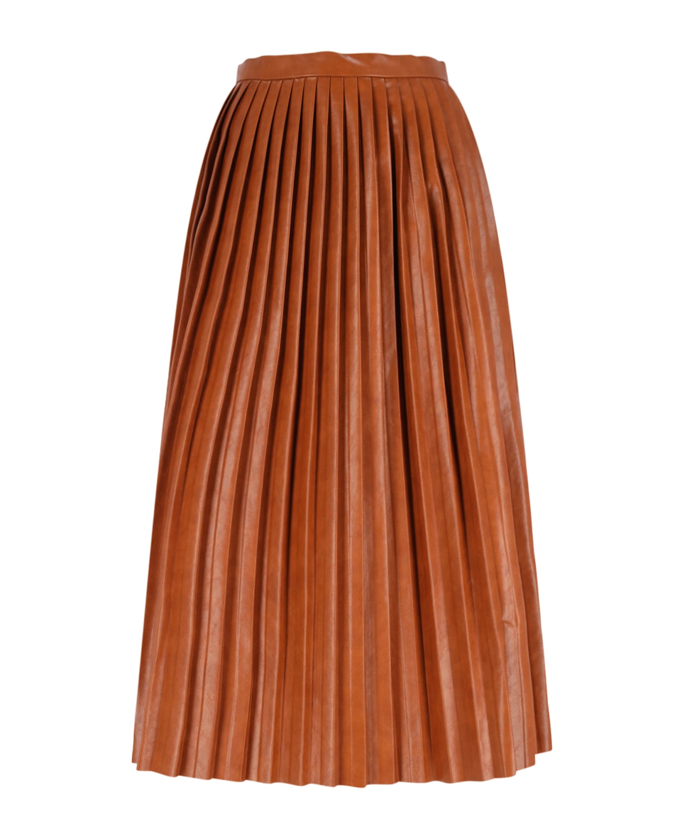 MM6 Maison Margiela brown viscose pleated midi skirt, pleated design, leatherette lining, high waist, side zipper closure, white logo stitching back, straight hem. Composition: 100% Viscose