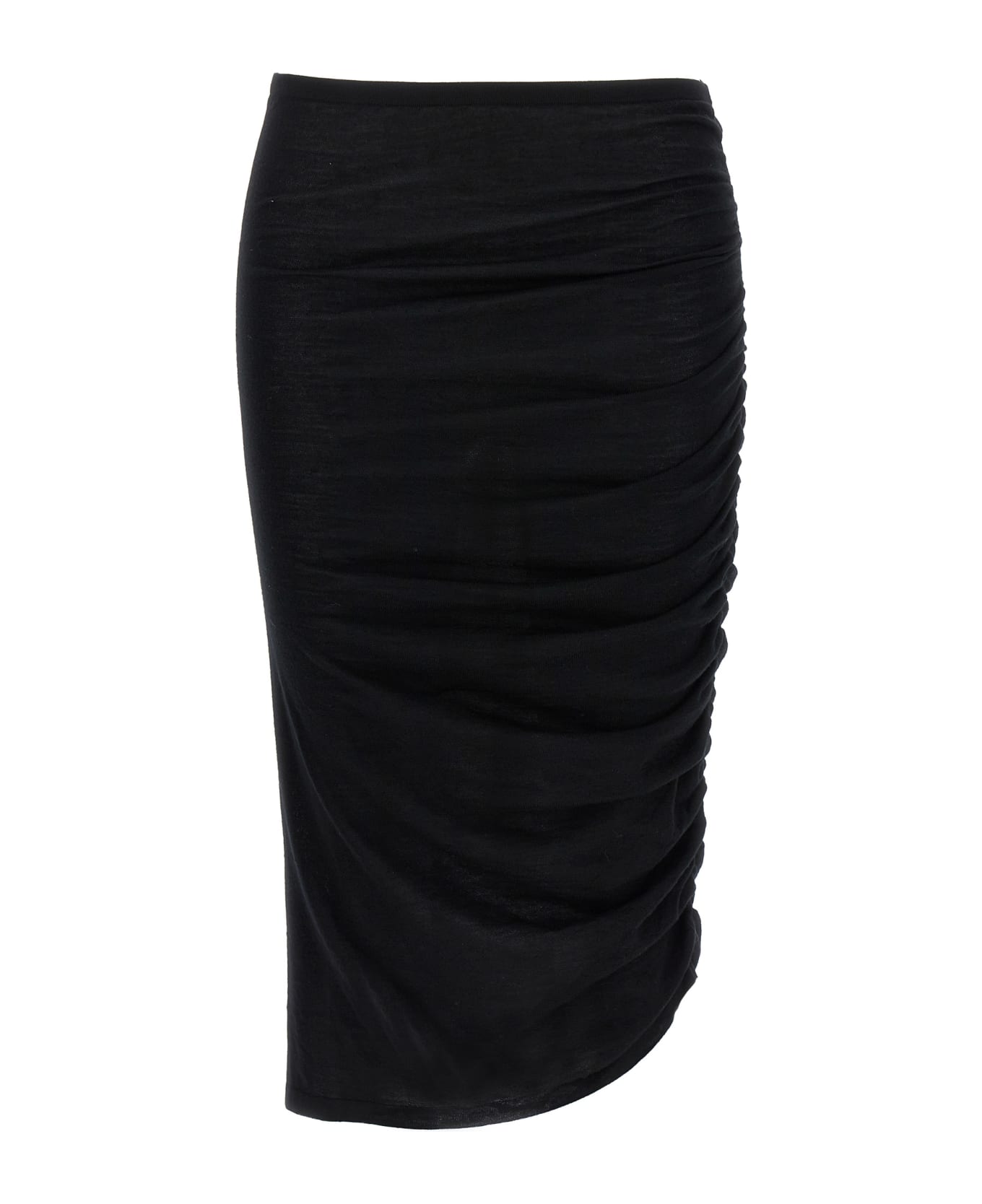 'Albane' skirt in merino wool knit, model with side draping. h side draping. Composition: 100% merino wool