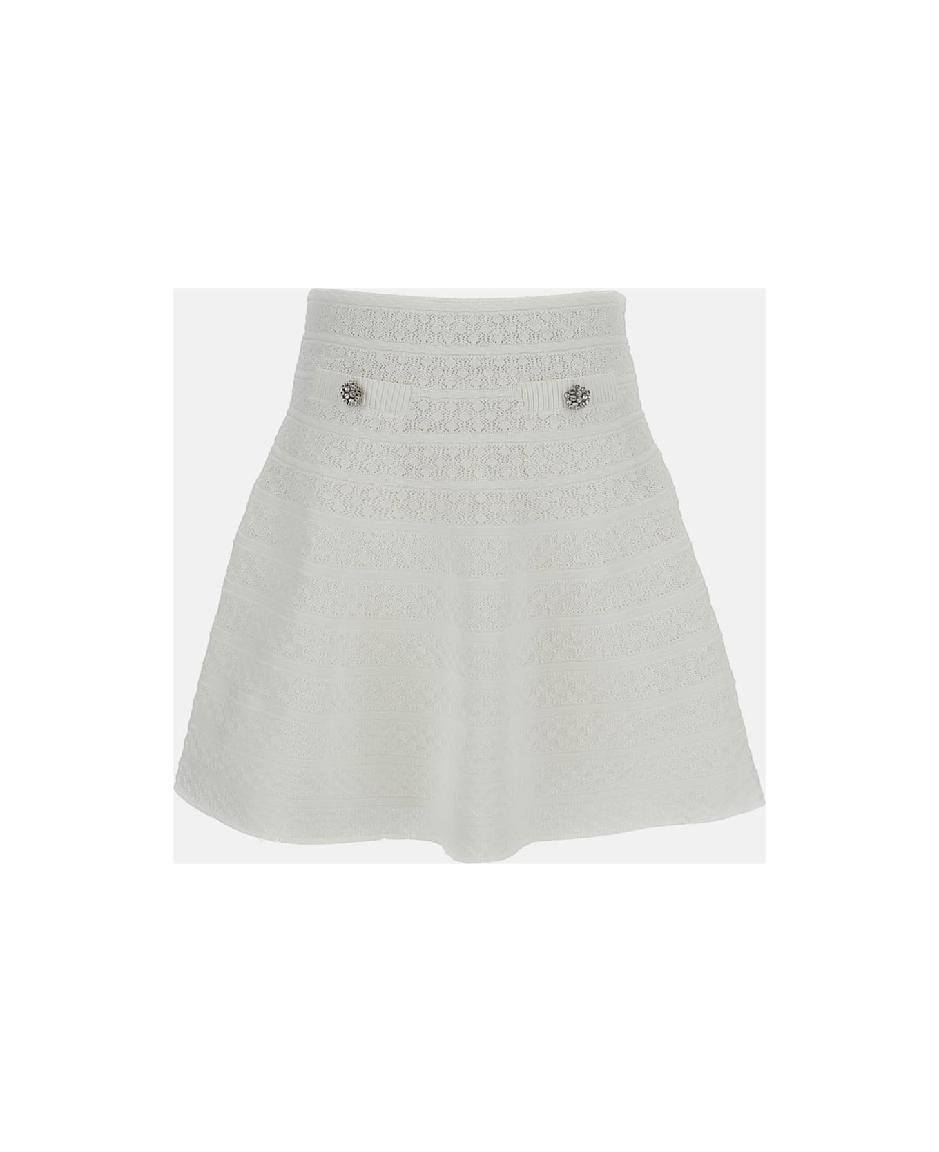 Pointelle knit mini skirt Skater-style pleated hem Diamanté embellishments on the front Elasticated waist Functional front pockets Stretch knit fabric Color: white