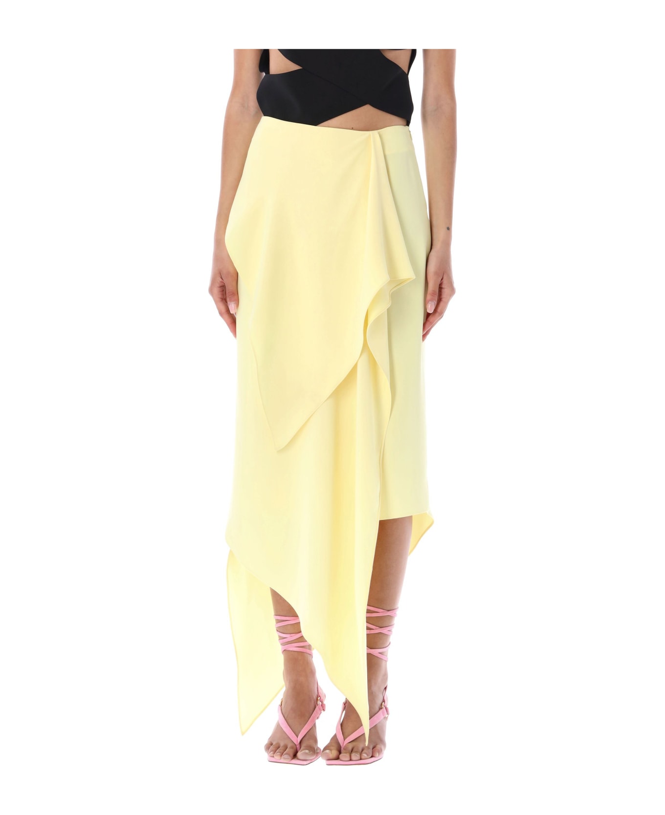 Yellow Light Fluid Crepe Wrap Effect Asymmetric Skirt By A. w. a. k. e. Mode. Featuring: - Low-waist - Side Zip Fastening - Layered Design - Asymmetric Hem