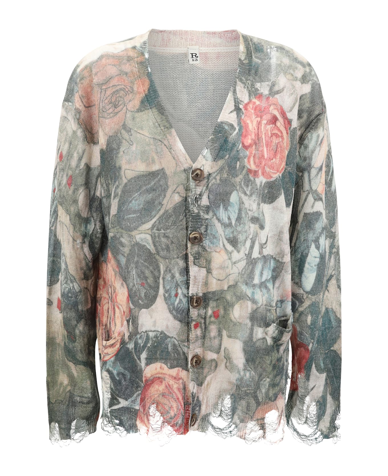 The r13 linen cardigan is an elegant piece with a vintage touch, perfect for those looking for a unique and sophisticated style. its v-neckline at the front and contrasting button fastening give it a refined yet relaxed look. the two welt pockets at the front add functionality and style, while the ribbed cuffs and hem offer a comfortable and structured fit. the multicoloured floral pattern and worn effect give the cardigan a distinctive character, creating an on-trend, worn-in vintage look. this versatile piece is perfect for adding a touch of colour and originality to your wardrobe, both for day and night.