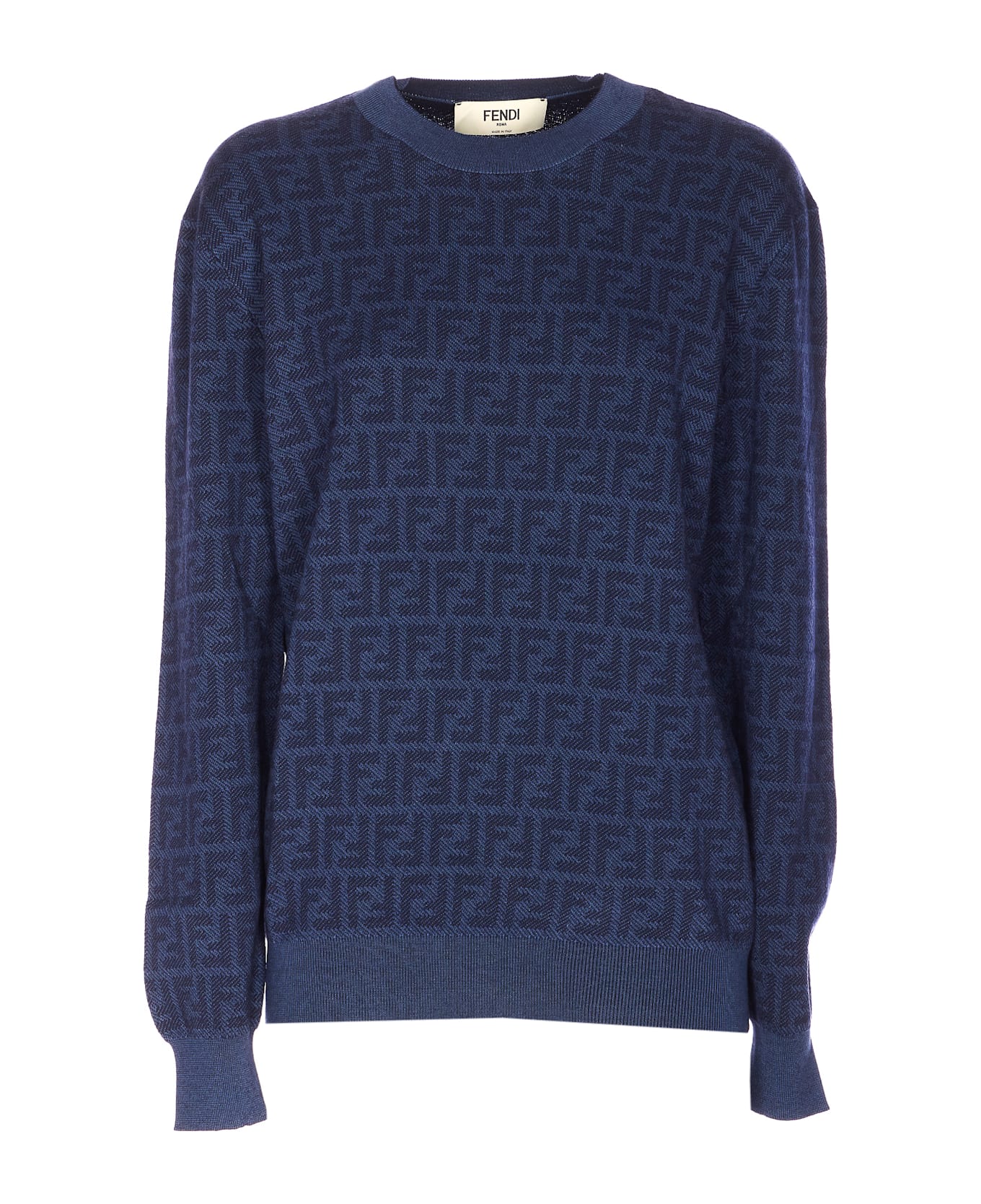 Fendi blue sweater, crewneck, long sleevs, all over FF logo Composition: 56% Wool, 44% Silk