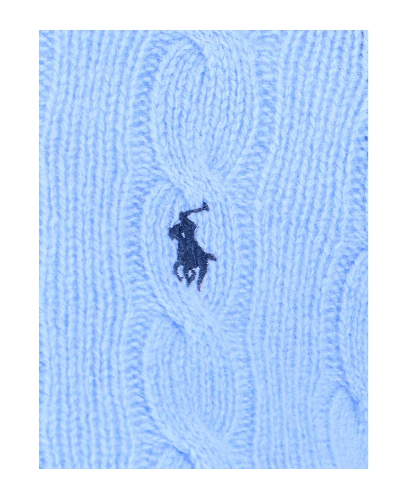 Polo Ralph Lauren logo braided sweater in light blue wool and cashmere with crewneck, blue chest logo embroidery, ribbed trim, and straight hem.
