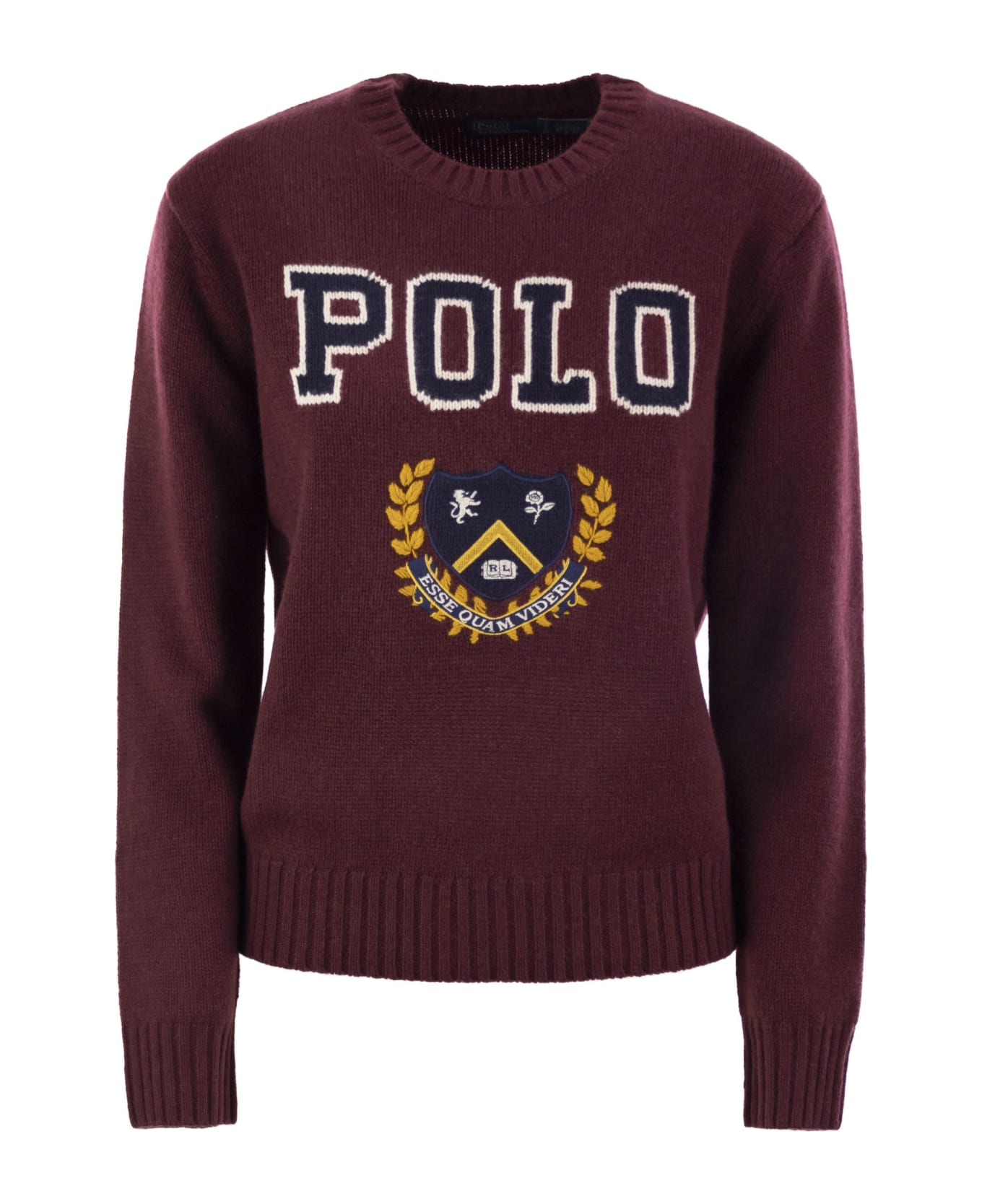 This wool sweater features a fitted silhouette and is embellished with collage-inspired embroidery in the center front. - Long sleeves with ribbed cuffs. - Contrasting inlaid knit stripes along sleeves. - Ribbed knit hem. - Collage-inspired Polo crest embroidered on front DESIGNER ID: 211943270 001
